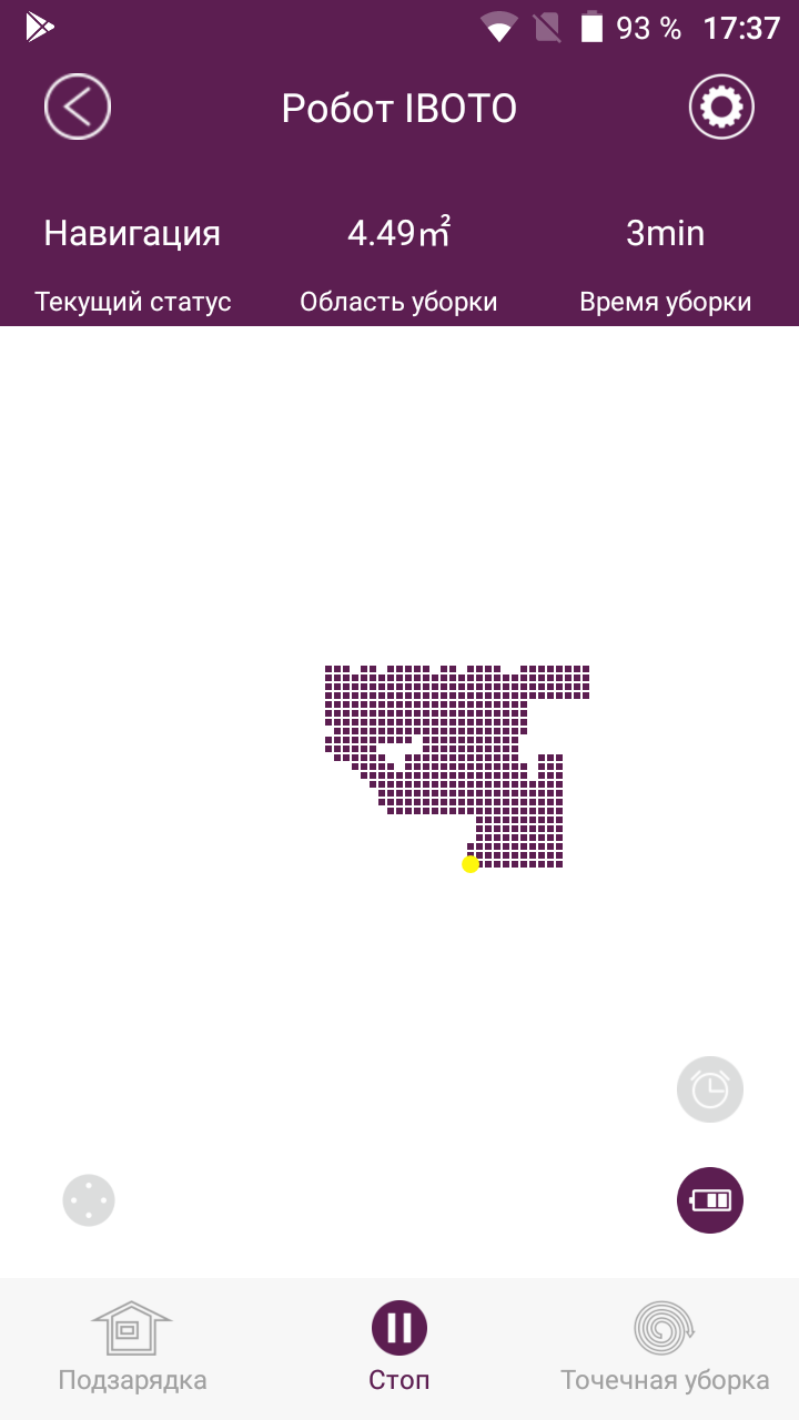 Построенная в приложении карта повернута на 90 градусов против часовой стрелки относительно приведенной выше схемы. В итоге для уборки помещения с удаленными друг от друга комнатами придется ставить базу где-то в центре. Убирая большое помещение, робот делит его на участки порядка 4 на 4 метра, которые убирает последовательно. Навигация у робота слегка сбилась. Как показала практика, навигация сбивается в основном тогда, когда колеса робота проскальзывают. То есть повороты корпуса робот отслеживает с помощью гироскопа, а перемещение — только с помощью датчиков вращения ведущих колес. Когда навигация сбивается, робот становится очень задумчивым и медлительным, что снижает скорость уборки.