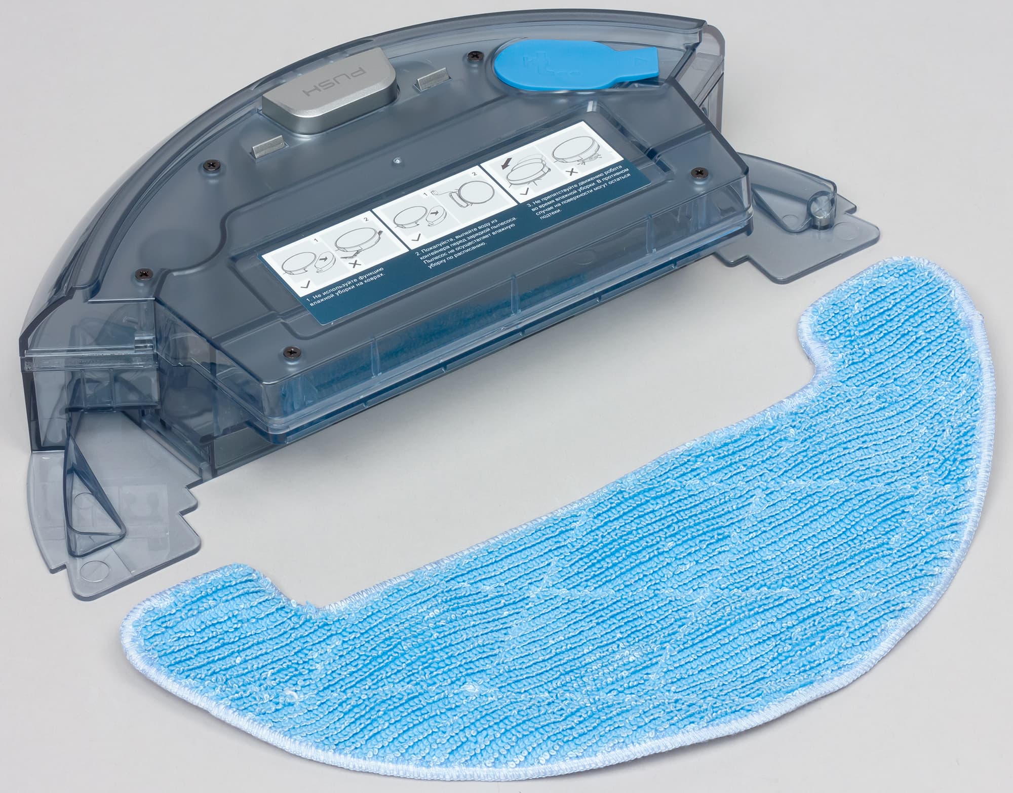 Для влажной очистки гладких полов вместо обычного пылесборника нужно установить входящий в комплект поставки специальный блок с контейнером для воды. На дно контейнера на липучке прикрепляется махровая салфетка из микроволокна. Салфетку можно предварительно увлажнить, а для поддержания ее во влажном состоянии в резервуар контейнера нужно залить воду. Жидкость на салфетку просачивается через три отверстия в днище резервуара.