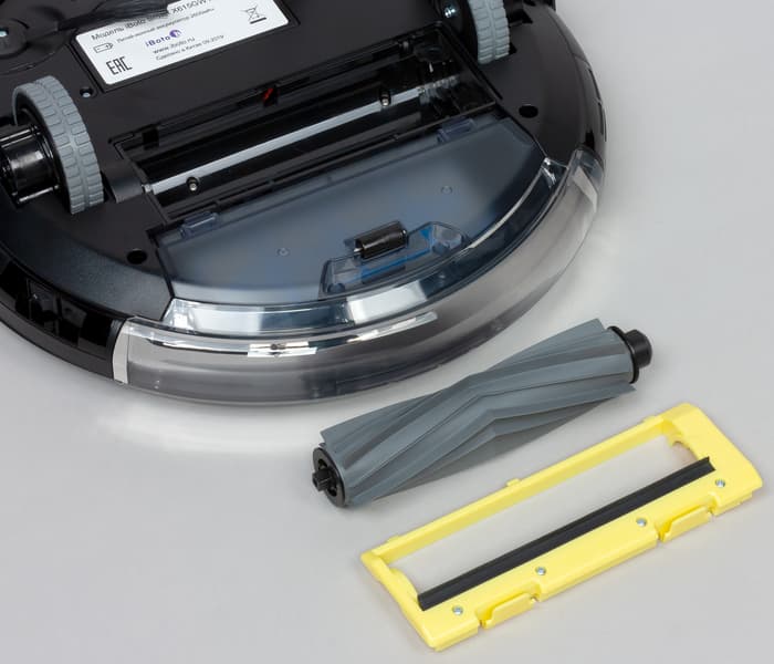 Передний ролик изготовлен из черного упругого пластика чередующегося с белым и жестким. Сделано это не просто так, а для того, чтобы робот с помощью оптического датчика, расположенного под роликом, мог определять, перемещается ли он во время уборки или нет.