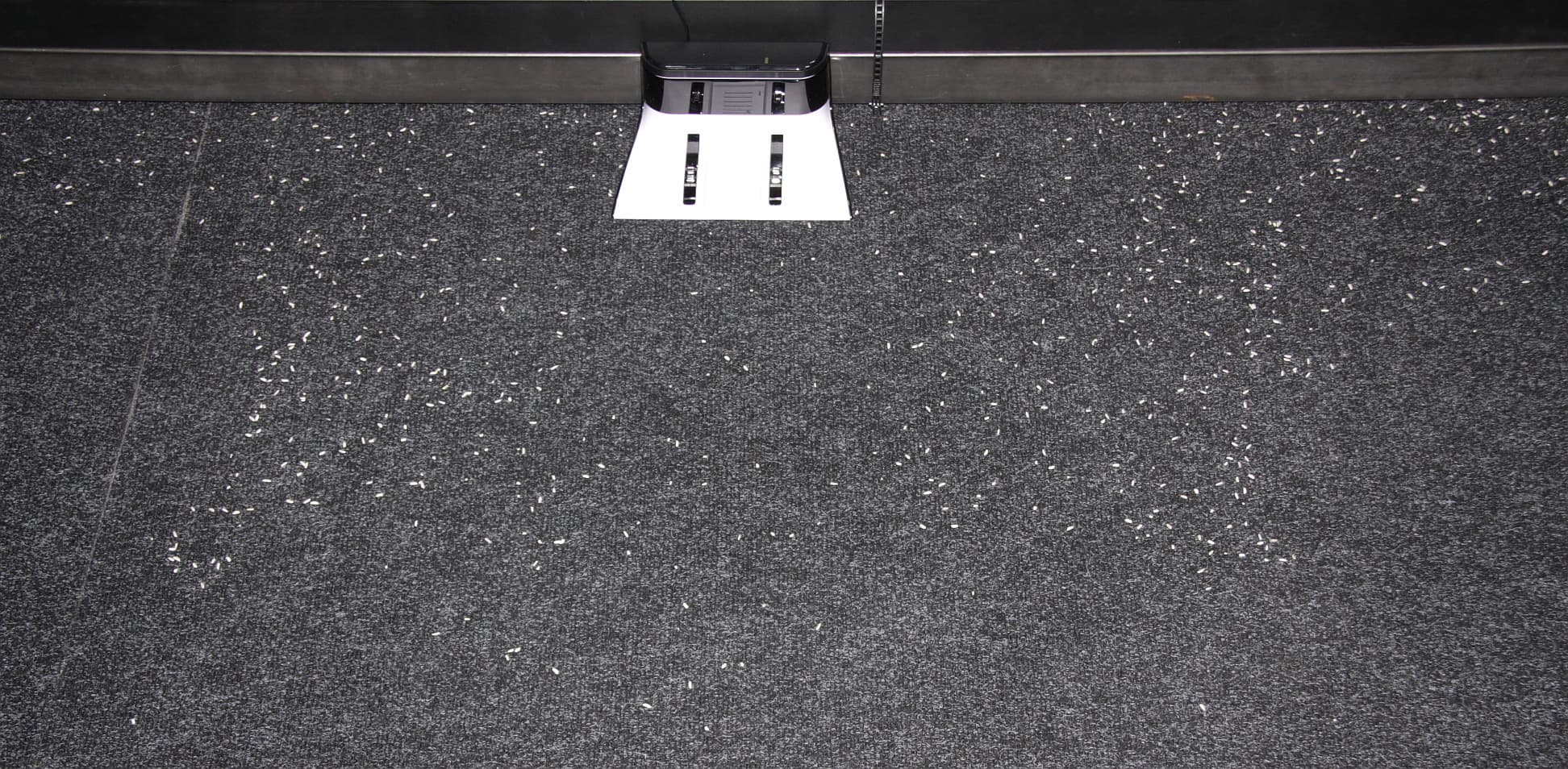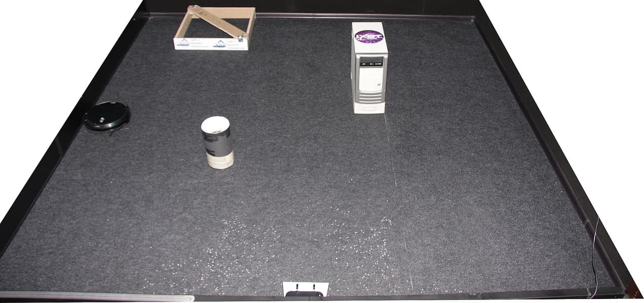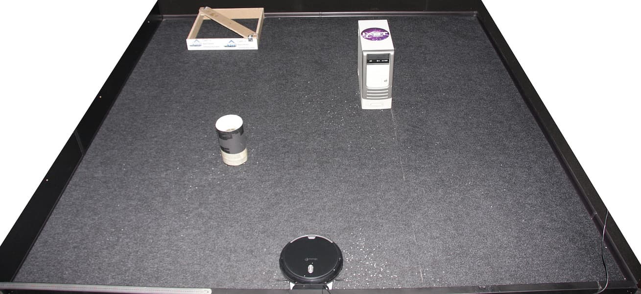 Предыдущие тесты показали, что увеличение мощности вентилятора не приводит к значимому улучшению качества уборки нашего тестового мусора (но точно увеличивает собираемое количество легкого мусора), поэтому все количественные тесты мы проводили с нормальной мощностью. Видео ниже снято с одной точки с почти полным охватом убираемой территории, база находится внизу по центру, при обработке часть видеоряда ускорена в десять раз, показано только начало уборки (первые 10 минут):