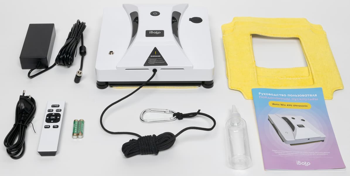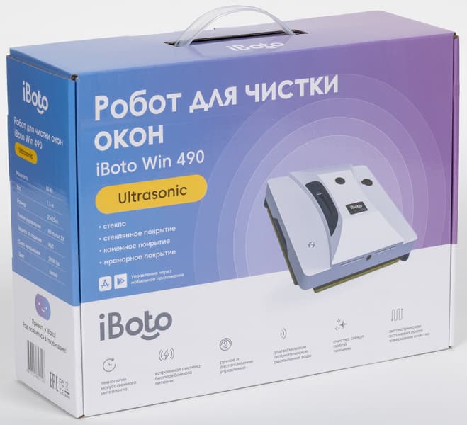 Робот прибыл в картонной коробке с полноцветной печатью. На ее передней стороне производитель разместил изображение прибора, а также перечислил основные его достоинства. В их числе упомянуты система бесперебойного питания, ручное и дистанционное управление, ультразвуковое автоматическое распыление воды и автоматическая остановка по окончании уборки. В список особенностей входят также некая «технология искусственного интеллекта» и возможность использования на стеклах любой толщины.