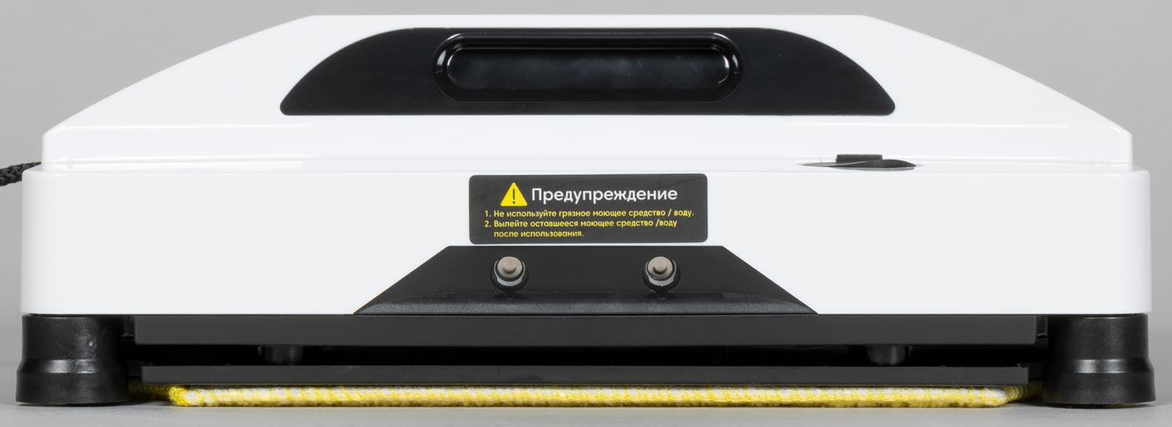 Квадратный корпус робота выполнен из белого пластика. Ручка с кнопкой управления, возвышающаяся над верхней панелью, отделана черным, такого же цвета и нижняя сторона прибора.