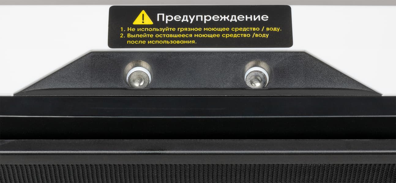 На торце, обращенном при уборке вверх, есть два распылителя для увлажнения поверхности стекла или кафеля. Рядом с ними — наклейка, предупреждающая о необходимости вовремя сливать воду из прибора и не использовать грязную жидкость.