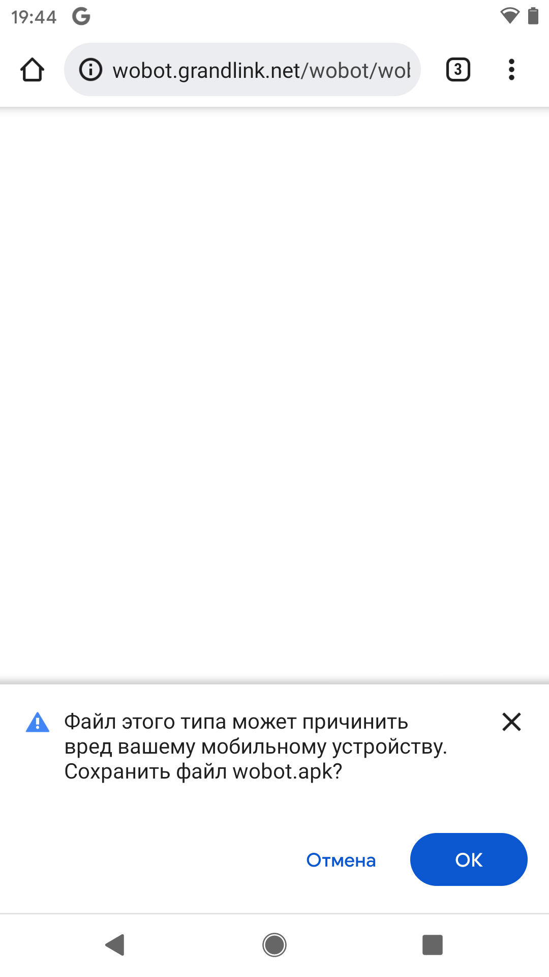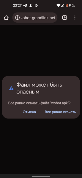 Ссылка, зашифрованная в коде, указывает не на страницу приложения в Google Play, а непосредственно на установочный пакет wobot.apk, размещенный на сайте wobot.grandlink.net. Современные версии Android по умолчанию блокируют установку программ из неизвестных источников, да и сам сайт не вызвал у нас доверия: ресурс, посвященный компьютерной RPG(!) и не снабженный вдобавок SSL-сертификатом, трудно назвать надежным источником. Поэтому для дальнейших экспериментов мы отложили рабочий смартфон и воспользовались подопытным устройством, которое завели специально для подобных случаев. В нем ограничен доступ к сети и нет никакой критичной информации.