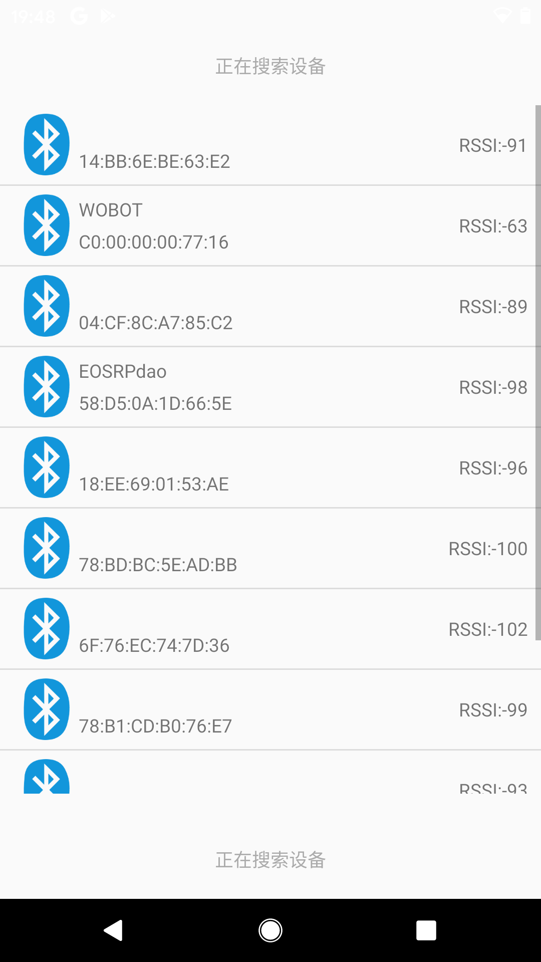 Несмотря на то, что интерфейс не содержит ни единой надписи, процесс синхронизации устройства с приложением прост и интуитивно понятен: Нажатием на кнопку с логотипом Bluetooth вызывается список приборов, доступных для подключения. Пользователю следует найти в нем строку со словом «Wobot» и кликнуть на нее. Никаких сообщений об успехе этого действия программа не выдает, но кнопки на главной странице начинают работать, а включенный робот теперь повинуется командам со смартфона.