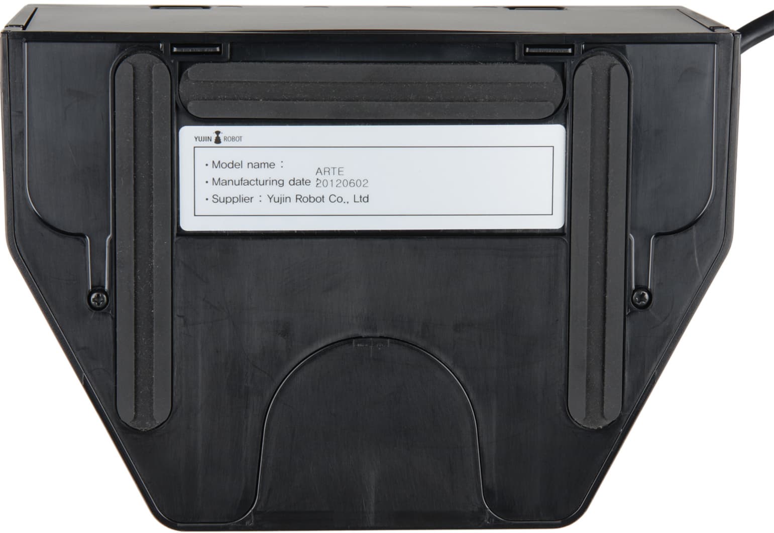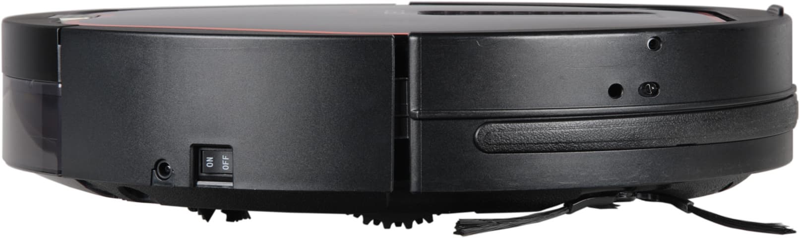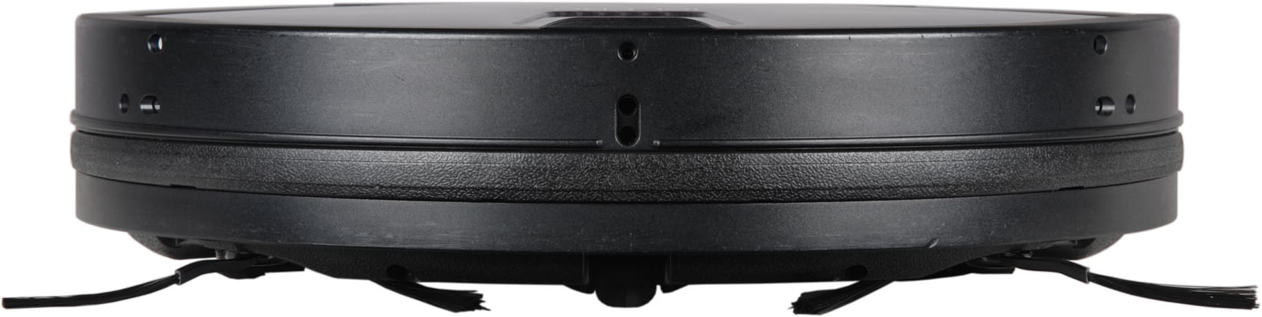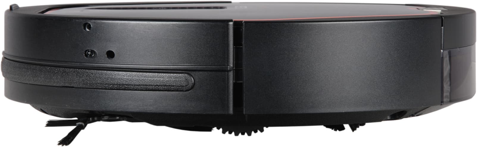 В едином блоке с контрольной панелью расположена и направленная вверх видеокамера. Кнопки, индикаторы и объектив камеры прикрывает пластина, выполненная, судя по идеальной гладкости и отсутствию царапин, из минерального стекла. Полуматовая пленка-светофильтр, прикрывающая область индикаторов, лежит неровно и имеет складки, что производит несколько странное впечатление. Также заметим, что индикаторы-иконки режимов больше похожи на кнопки, чем собственно кнопки, обозначенные белыми значками в задней части контрольной панели. Видимо, где-то на верхней панели находится и ИК-датчик приема сигналов с пульта ДУ. Днище, боковые поверхности и бампер изготовлены из немаркого черного пластика с матовой поверхностью. Всю переднюю половину корпуса огибает подпружиненный бампер с небольшим ходом. В передней части бампера есть небольшой выступ. Этот выступ является самой высокой частью пылесоса и, соответственно, определяет минимальный просвет препятствия (например, дивана), под которое пылесос еще может забраться. Согласно нашим измерениям этот просвет равен 88 мм (приведем и полученные значения ширины и длины — 350 и 353 мм, соответственно). Спереди на бампер наклеена узкая полоска из полиэтилена, на которой повреждения от столкновений с препятствиями практически нельзя обнаружить.