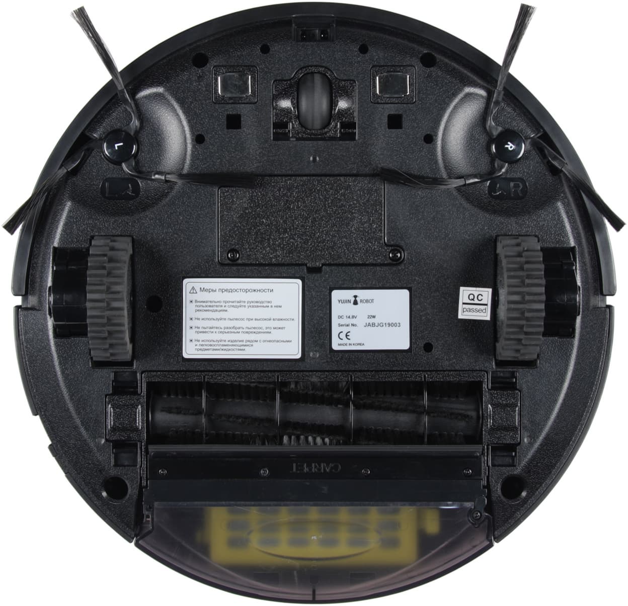Перевернув пылесос вверх днищем, мы увидим две контактные площадки, передний неповоротный ролик, две боковые щетки, крышку отсека АКБ, два ведущих колеса на подпружиненных рычагах, отсек с основной щеткой и полупрозрачное дно пылесборника.