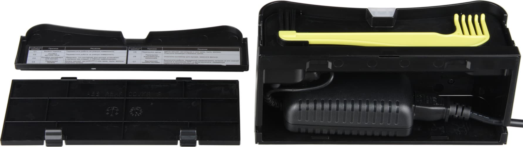 Во-первых, под верхней крышкой закреплена щетка-гребенка, при помощи которой можно чистить пылесборник, основную щетку, датчики и т. д. А снизу на верхнюю крышку наклеена табличка, разъясняющая коды ошибок. Во-вторых, задняя крышка базы прикрывает отсек, куда устанавливается внешний адаптер питания.