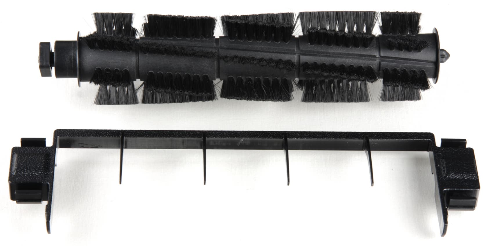 При обслуживании пылесоса боковые щетки просто с усилием снимаются с осей, а основная щетка и передний ролик вынимаются после удаления фиксирующих пластиковых вставок. Вставка основной щетки довольно хлипкая на вид, правда, пластик качественный, поэтому случайно эту деталь сломать сложно.