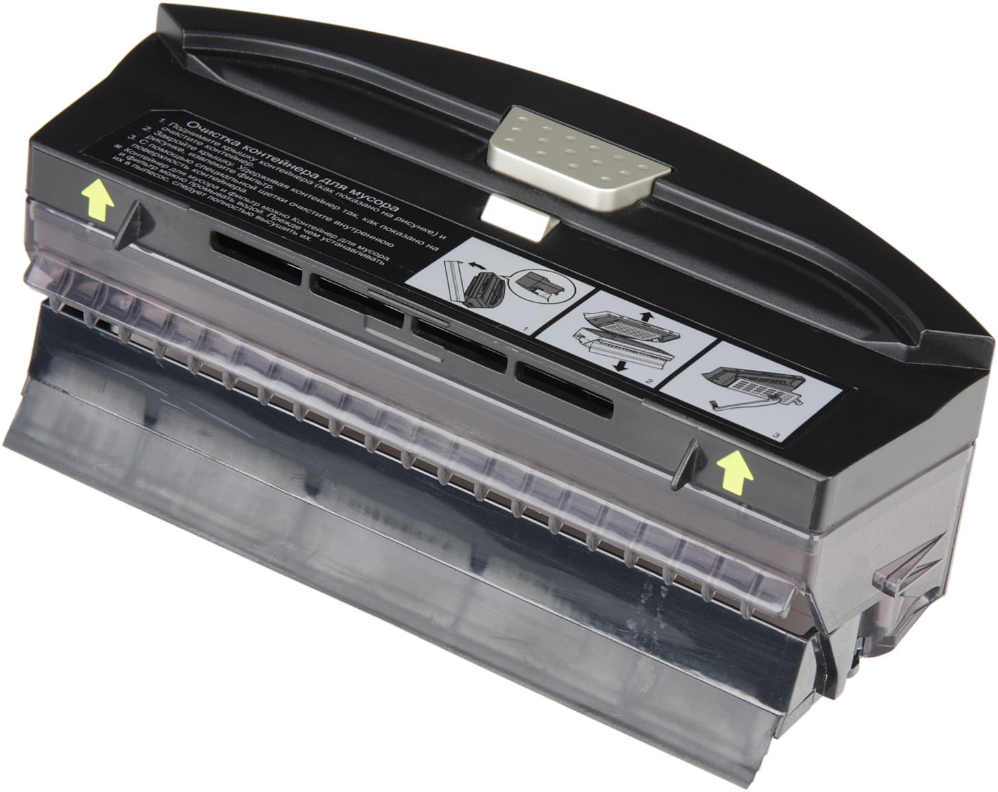 Очищать пылесборник очень просто и удобно: снимается верхняя крышка и пыль вытряхивается. Также можно откинуть скребок на шарнире и вытряхнуть пыль через открывшуюся щель, но смысла в этом нет, так как первый вариант гораздо удобнее. При необходимости вынимается и очищается фильтр, прижатый желтой пластиковой решеткой.