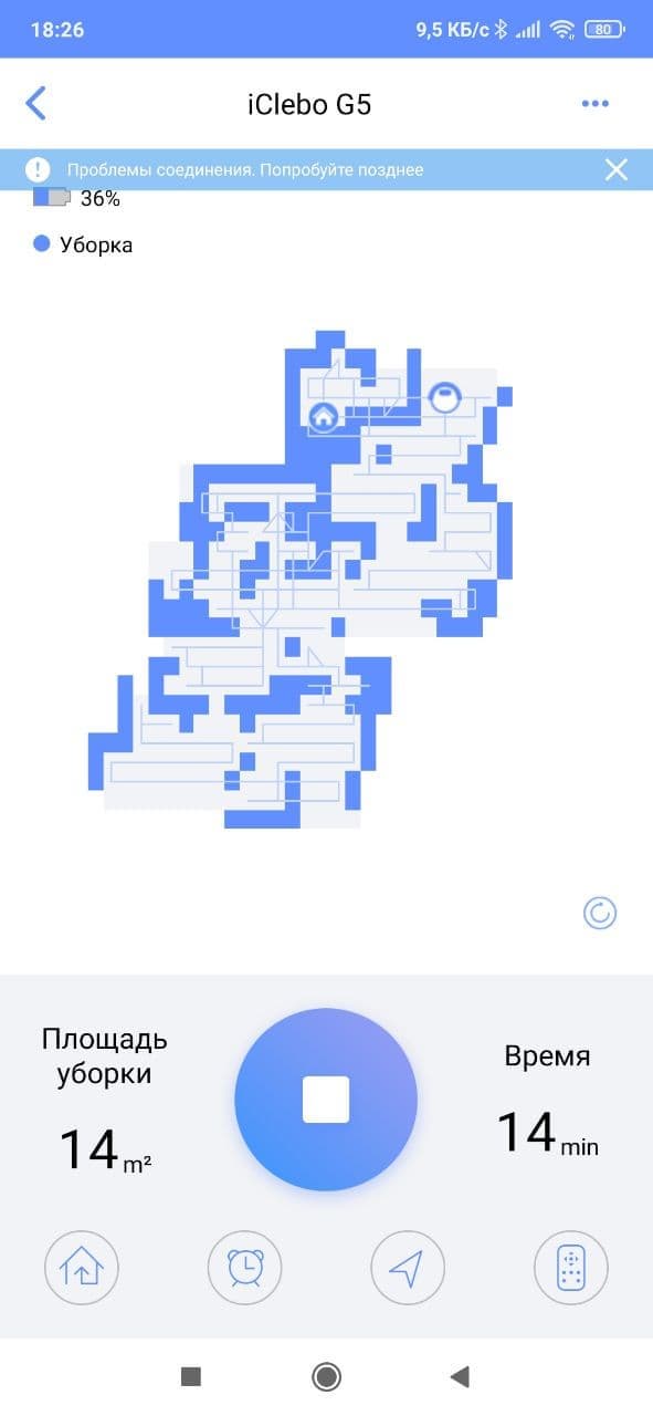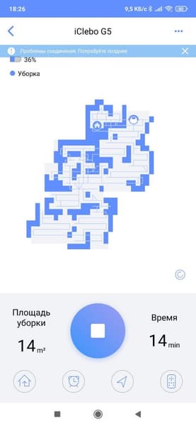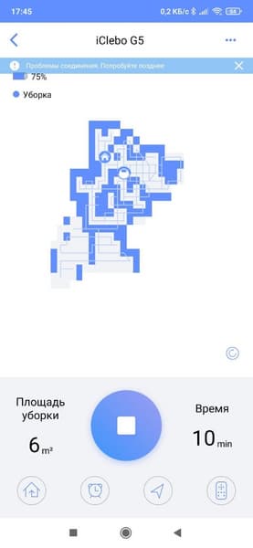 За первые 10 минут робот обошел всю тестовую площадку, ни разу не посетив «ловушку» в левом дальнем углу. В самом начале уборки произошла небольшая задержка: пылесос сообщил о необходимости перезагрузиться.