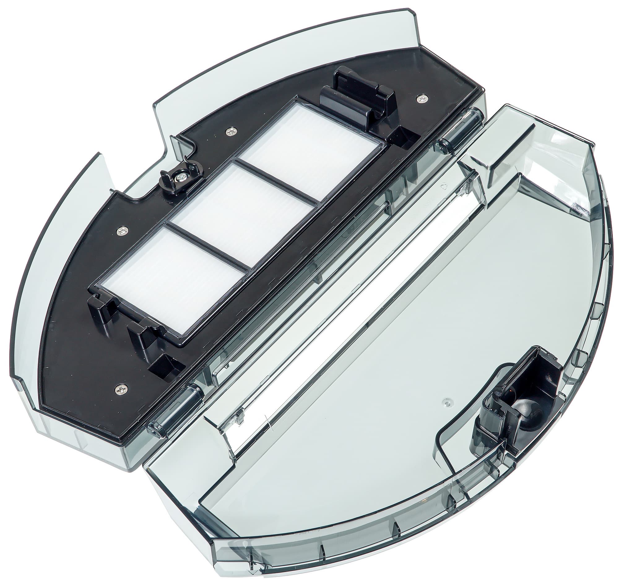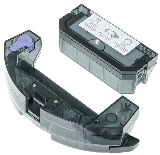 Модули пылесборника и влажной уборки устанавливаются в один и тот же слот и фиксируются с помощью защелки-кнопки. Модуль сухой уборки имеет откидную крышку, которая фиксируется с помощью той же самой кнопки-защелки, а также небольшую пластиковую шторку, которая не даст мусору высыпаться из модуля во время его переноски (от пылесоса до мусорного ведра). Под крышкой расположен прямоугольный фильтр тонкой очистки, состоящий из предварительного поролонового и HEPA-элемента. Для получения доступа к HEPA-фильтру придется открыть еще одну пластиковую крышку на защелке.