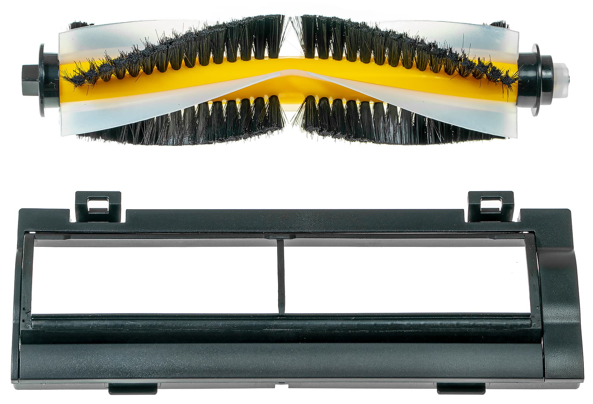 В центре нижней панели расположена основная электрощетка с V-образными резиновыми ламелями, чередующимися с рядами синтетической щетины. Фиксируется она обычной пластиковой рамкой с двумя защелками.