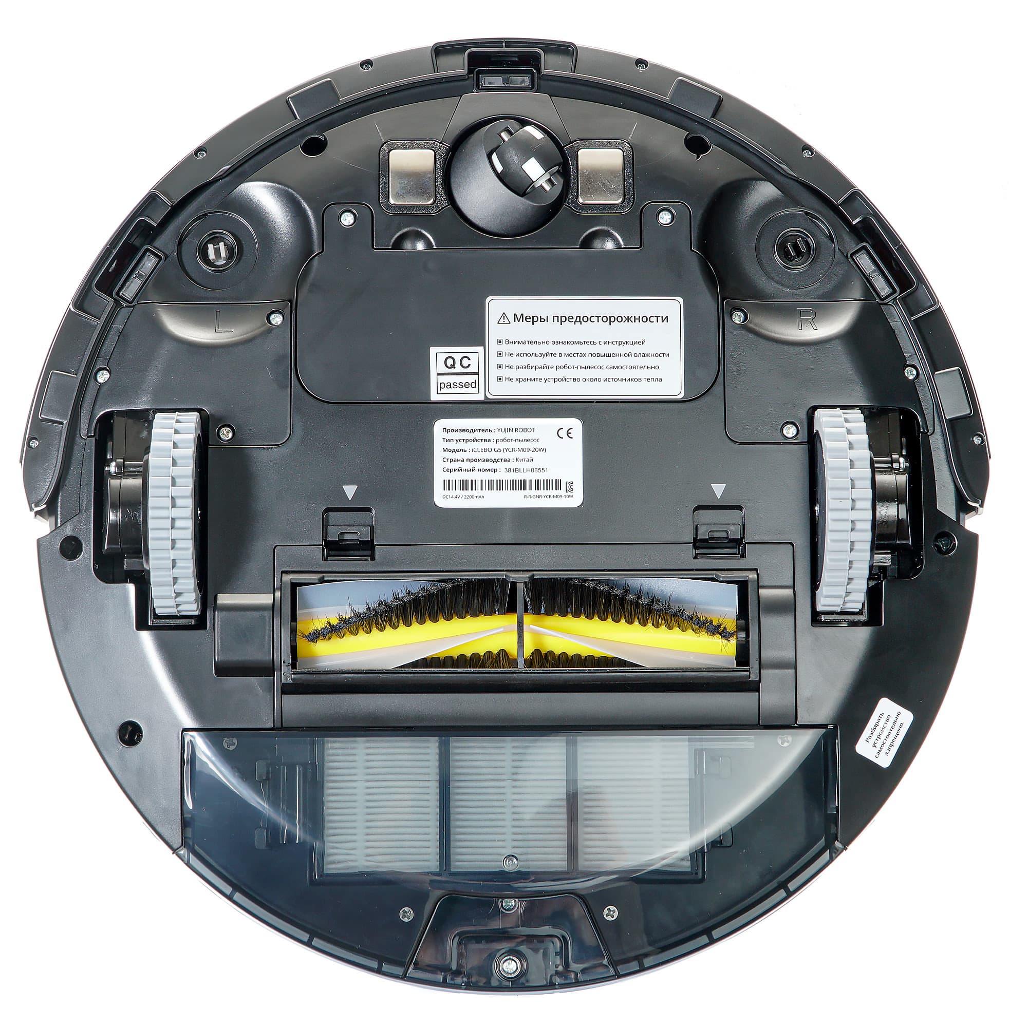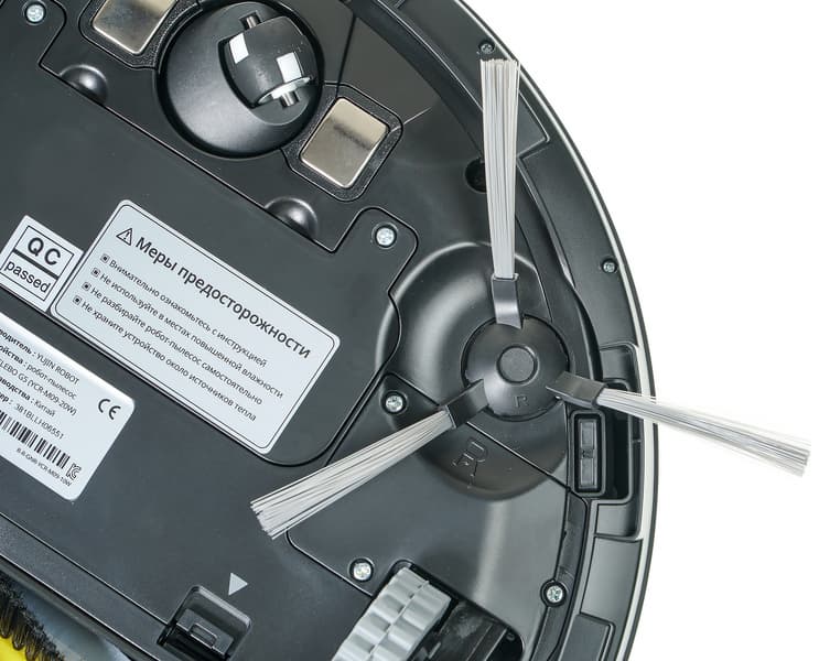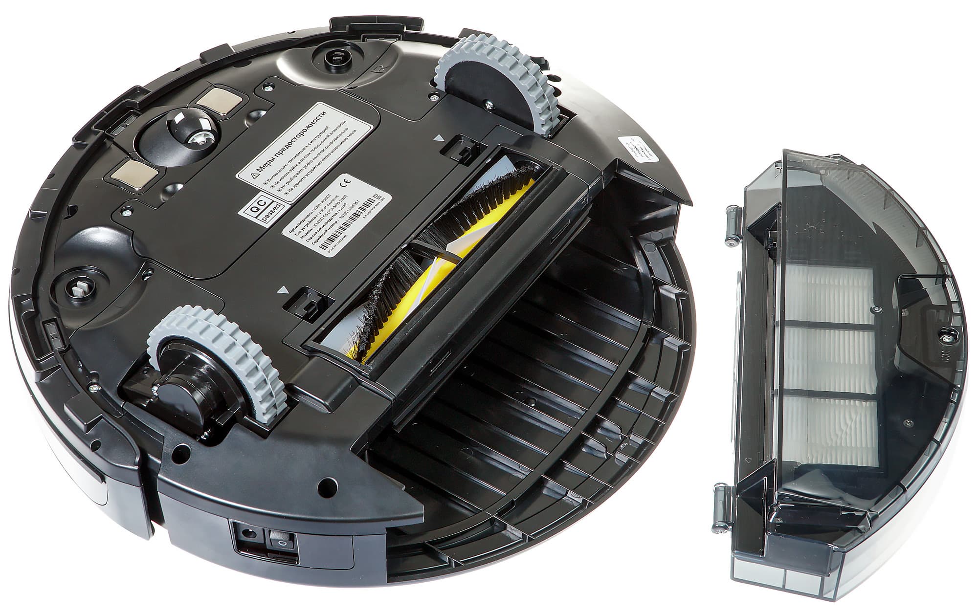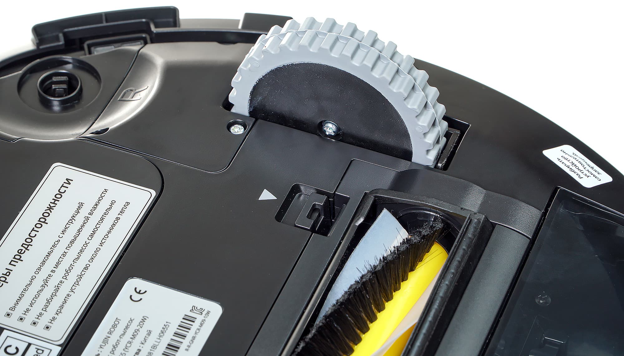 Направляющее колесо пластиковое. Оно заключено в пластиковую сферу, допускающую свободное вращение на 360°. По обе стороны от колеса размещаются контакты для зарядки на базе. Также в передней части корпуса можно увидеть гнезда для крепления боковых щеток, а по центру и по бокам— окошки оптических (инфракрасных) датчиков поверхности.