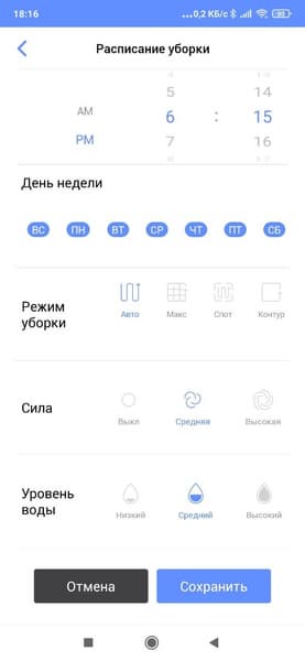 К тому же с помощью приложения получится настроить автоматический запуск робота в произвольные дни недели в выбранном режиме.