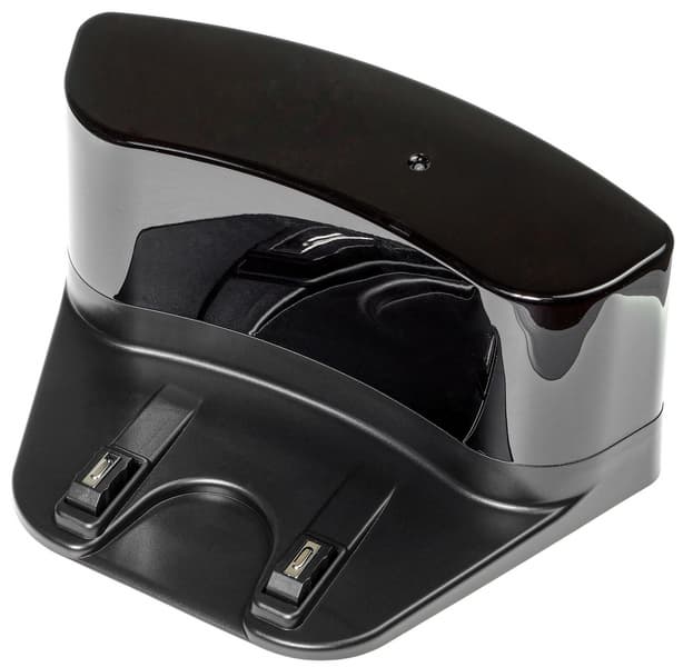 Верхняя часть пластиковой базы выполнена из ИК-прозрачного пластика, под которым стоят датчики, обеспечивающие позиционирование робота при возвращении на зарядку. У базы есть светодиод, сигнализирующий о ходе заряда батареи. Контакты подпружинены и имеют ход около 3 мм.