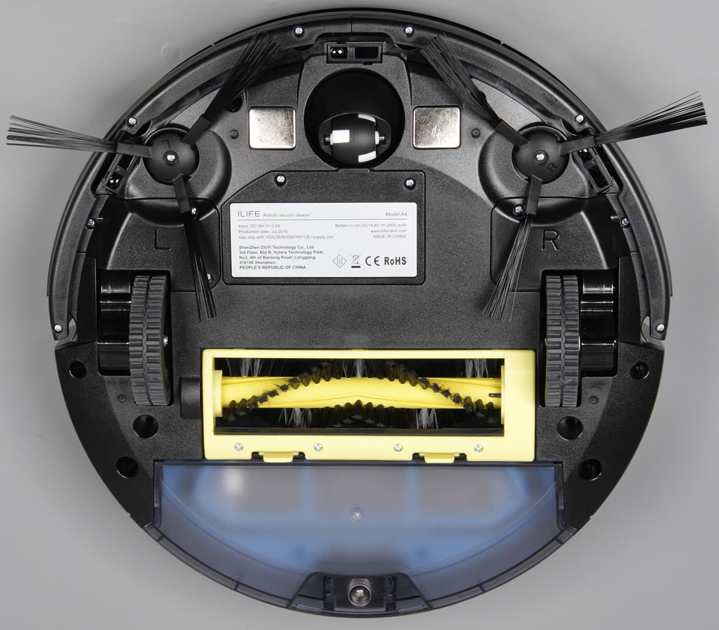 Результаты измерений габаритов и веса приведены в таблице выше. Роботы имеют корпус в плане почти идеально круглой формы с относительно небольшой высотой и без выступающей вверх башенки. Оси ведущих колес расположены на одном диаметре окружности корпуса, это позволяет роботу совершать разворот на месте без изменения границ, занимаемой им площади. Ведущие колеса оснащены цепкими резиновыми покрышками с выраженными грунтозацепами. Колеса установлены на подпружиненных шарнирах, что также улучшает способность робота преодолевать препятствия. Всю переднюю половину корпуса огибает подпружиненный бампер с небольшим ходом. Сдвиг бампера вызывает срабатывание механических датчиков препятствий. Для защиты мебели спереди на бампер в нижней его части наклеена полоса из резины средней жесткости. Выше на бампере за окошком из тонированного пластика находятся ИК-датчики обнаружения препятствий, базовой станции и, возможно, приемник команд с пульта ДУ. Что-то из перечисленного, видимо, также расположено за тонированными окошками на корпусе за бампером ближе к задней части пылесоса (iLife A4) или за одним окошком сзади по центру (iLife V7 и X5). Посмотрев на роботов со стороны днища, можно выявить различия в том, как и чем роботы собирают мусор. iLife A4 — две боковые щеточки, основная со щетиной и резиновый скребок на рамке: