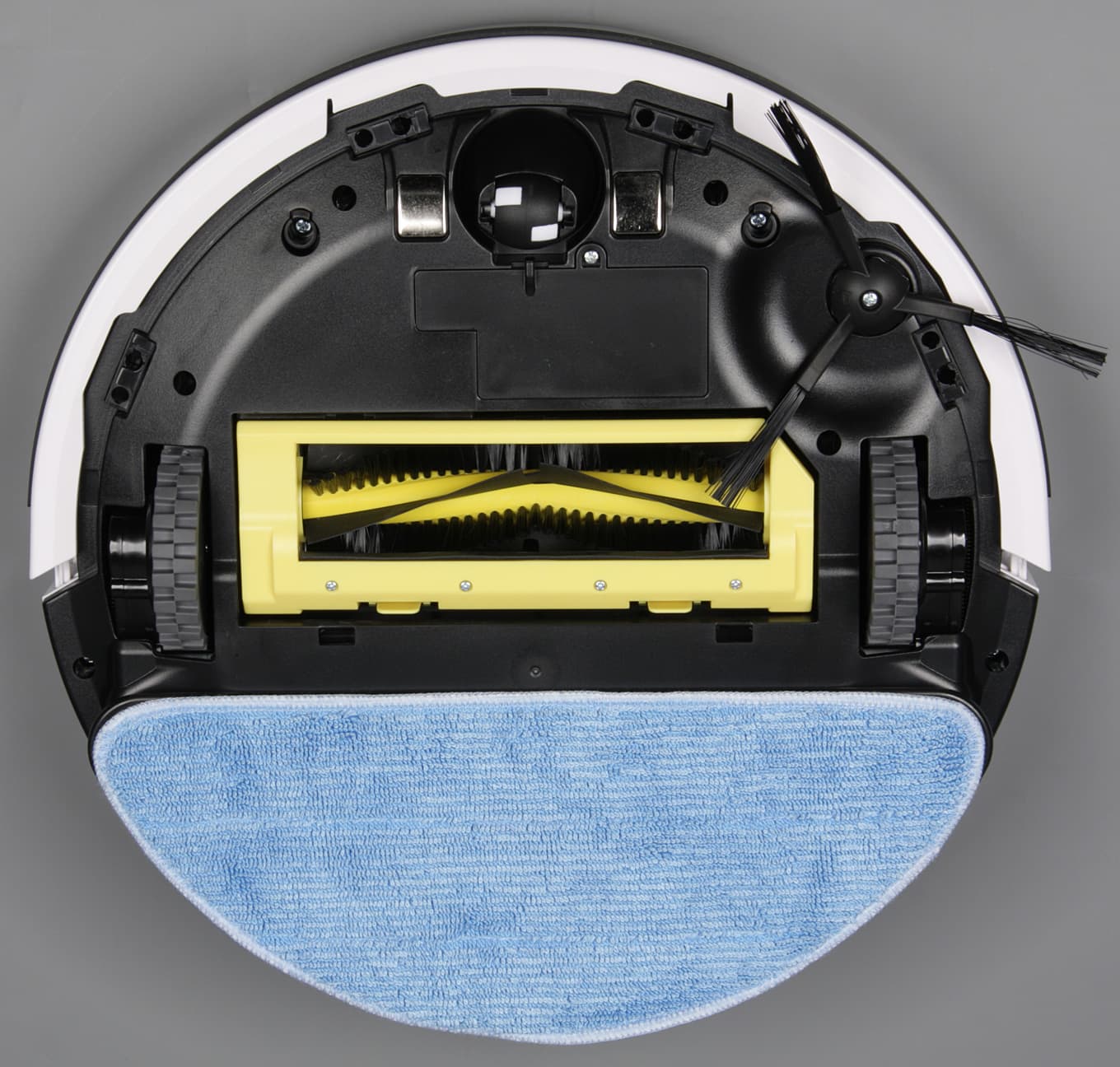 Отметим, что у iLife A4 и V7 передний ролик является частью датчика перемещения, что в теории позволяет роботу как-то менять свое поведение в сложных ситуациях (если он где-то застрял). На практике не проверяли. И еще, редукторы приводов щеток и колес позволяют их проворачивать рукой, это очень помогает, когда нужно вытащить робота, например, из под дивана, под которым он застрял, или распутать что-то намотавшееся на колеса или щеточки. Для дополнительной влажной или сухой очистки гладких полов на днище роботов iLife V7 и X5 закрепляется протирочная насадка, на которую на липучке прикрепляется махровая салфетка. Вот как это выглядит в случае iLife V7: