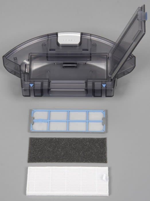 Запасные части и расходные материалы в комплекте поставки представлены сменным складчатым фильтром последней ступени, валиком-скребком и набором (правая и левая) боковых щеток. Есть и комбинированная щетка-гребенка, которую можно использовать для чистки пылесборника, самого робота и основной щетки в частности.