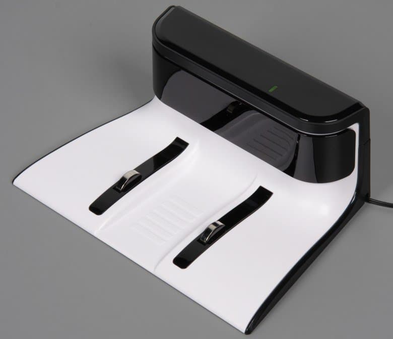 Питается база от внешнего адаптера питания, который также можно использовать для зарядки робота, минуя базу, если по какой-то причине она недоступна. Кабель можно уложить в каналы на днище базы и вывести на правую или на левую сторону.