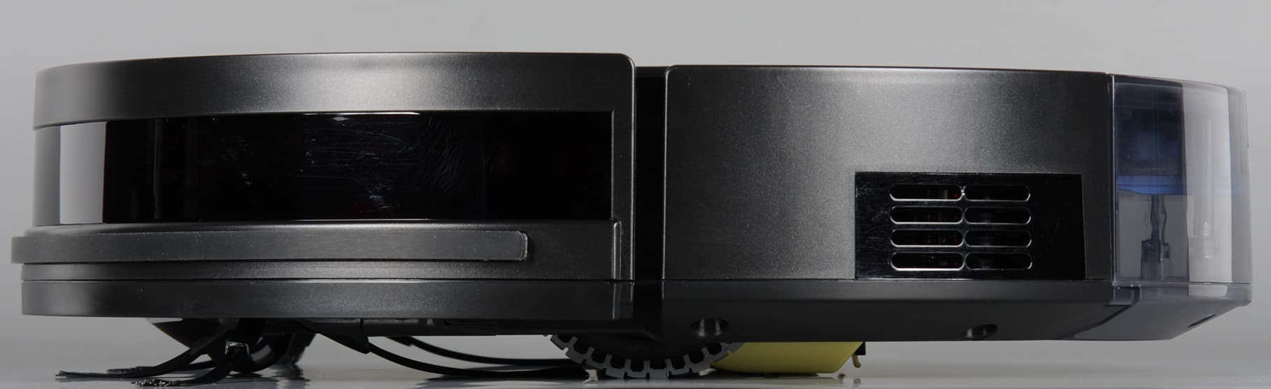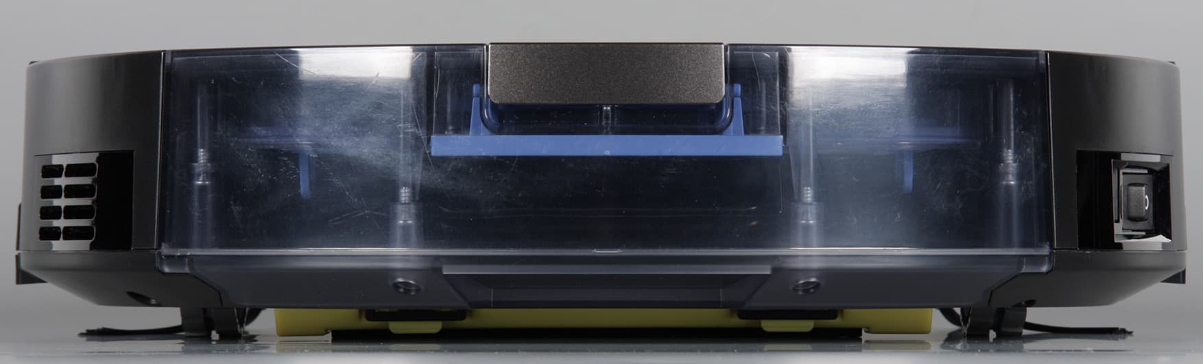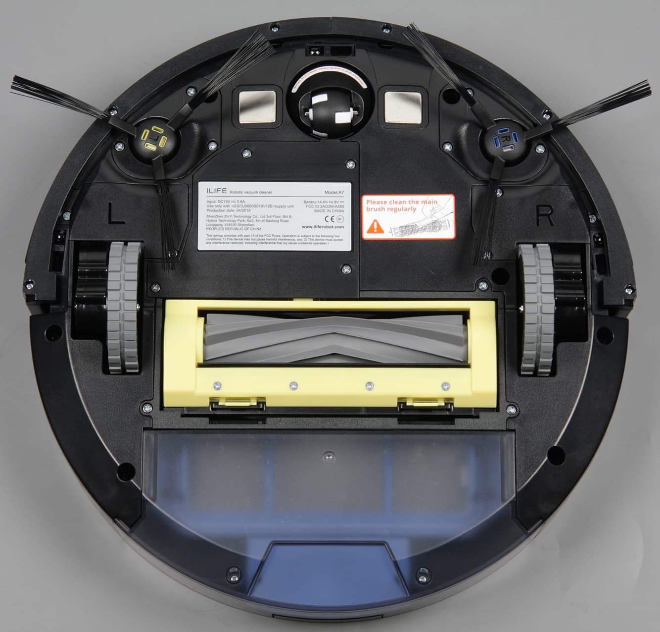 На днище расположены две контактные площадки, передний опорный поворотный ролик, боковые щеточки, крышка батарейного отсека, два ведущих колеса, отсек основной щетки. Ближе к краю сразу за бампером находятся три ИК-датчика перепада высоты, благодаря которым робот-пылесос может избежать падения со ступенек.