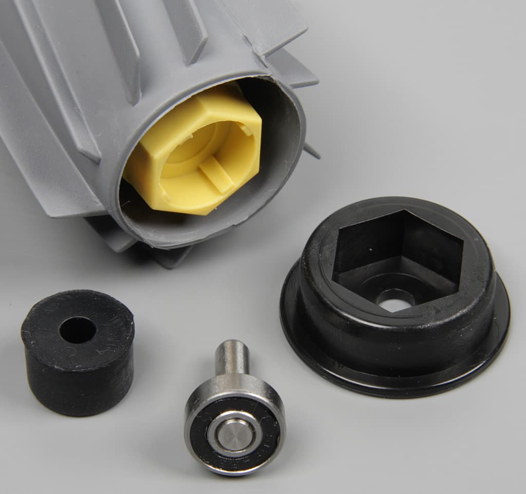 На торцы оси обоих щеток плотно насажены заглушки из черного пластика. Из центра одной выходит стальная ось, которая, вращается в шариковом подшипнике, запрессованном в торец оси щетки. На эту ось надевается втулка из резины, которая по замыслу разработчиков должна снижать шум и вибрации.
