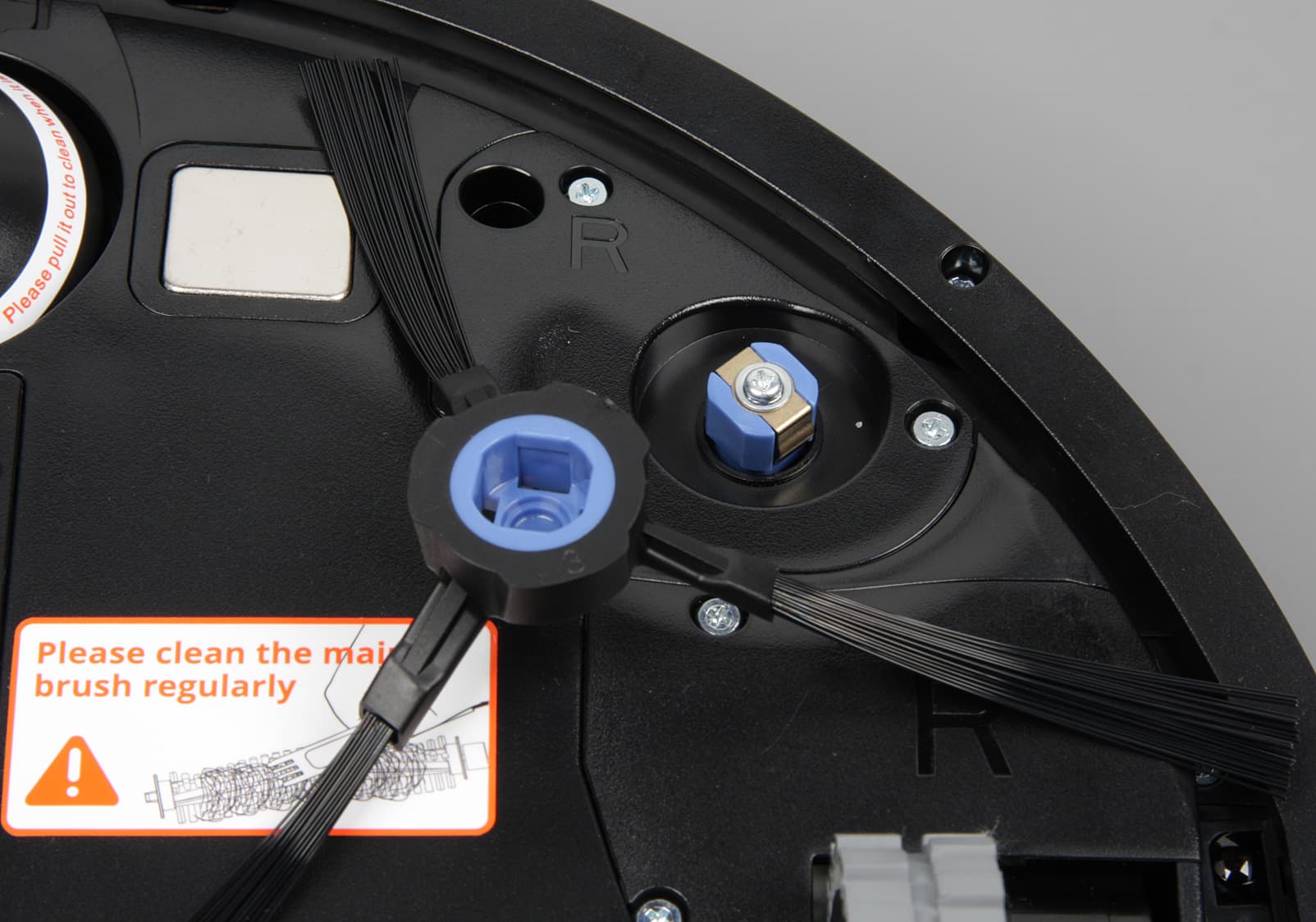 Боковые щеточки имеют длинную и относительно жесткую пластиковую щетину, пучки которой выходят из упругих поводков. Как показала практика, эта щетина хорошо сохраняет форму. Правая и левая щеточки отличаются поворотом поводков, а чтобы пользователь знал, какую куда устанавливать, на щеточках и на днище выдавлены буквы L и R, а цвет центральной вставки на щеточке соответствует цвету оси привода. К осям приводов щеточки крепятся с помощью пружинного фиксатора, что очень удобно.