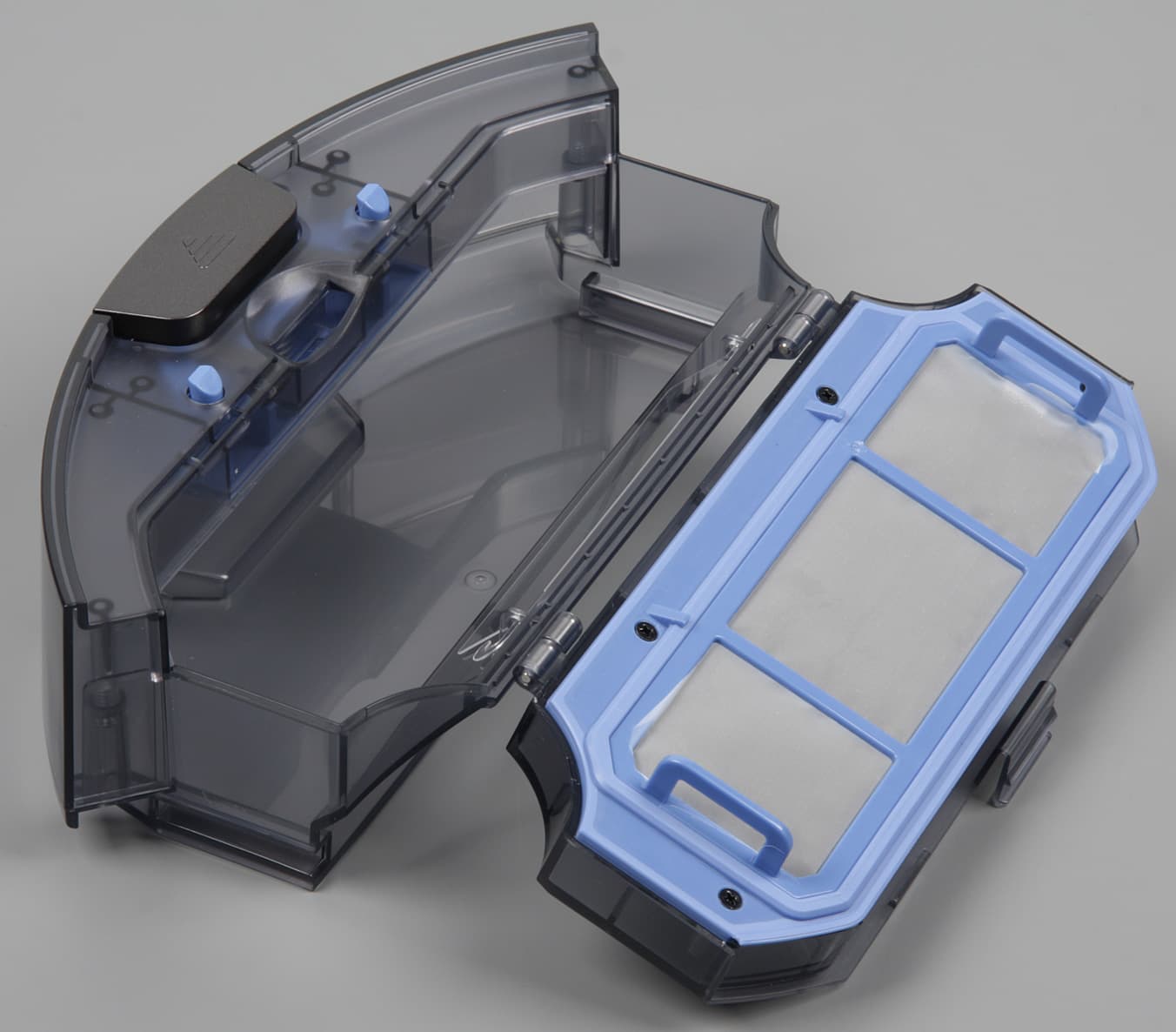 Корпус пылесборника выполнен из слегка тонированного прозрачного пластика, поэтому степень его заполнения можно оценить, рассмотрев содержимое через заднюю стенку. Специальная шторка из прозрачного пластика предотвращает выпадение мусора через отверстие для входа воздуха. Верхняя часть пылесборника откидывается на большой угол, что позволяет без труда вытряхнуть скопившийся мусор или почистить пылесборник обычным пылесосом с щелевой насадкой.