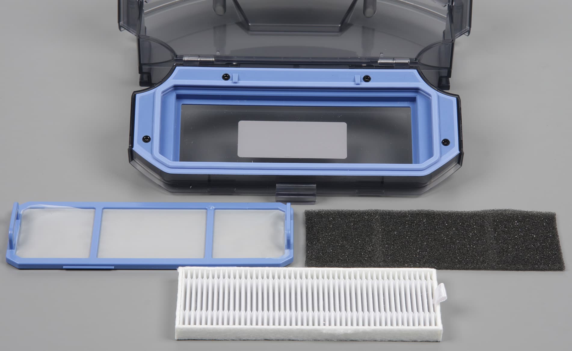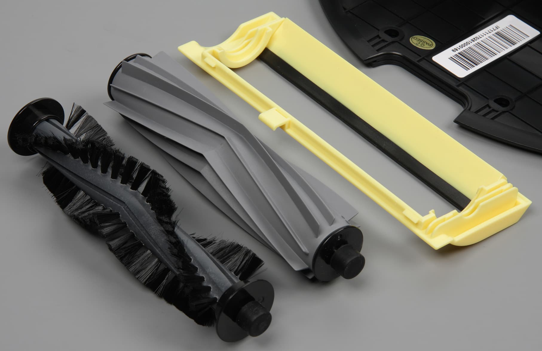Запасные части и расходные материалы в комплекте поставки представлены щеткой с ворсом (валик-скребок установлен), сменным складчатым фильтром последней ступени и набором (правая и левая) боковых щеток. Есть и комбинированная щетка-гребенка, которую можно использовать для чистки пылесборника, самого робота и основной щетки в частности.
