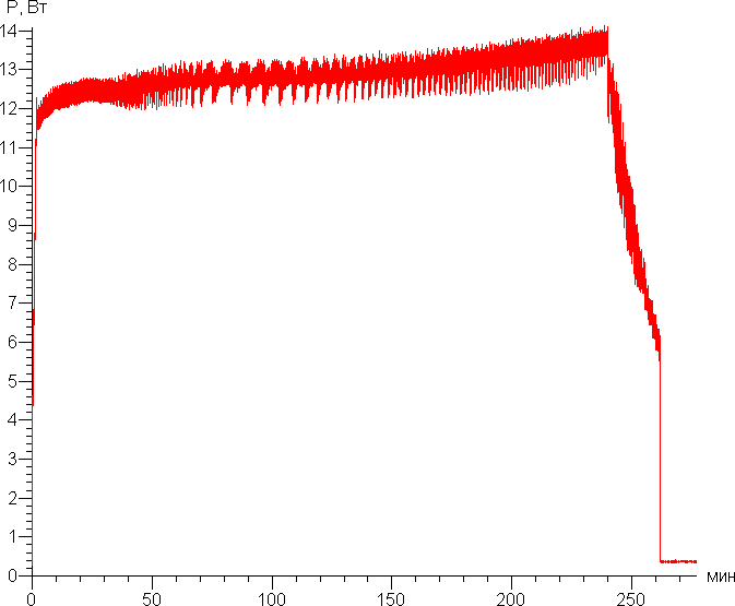 В режиме с нормальной мощностью вентилятора робот может убирать без подзарядки примерно 2 часа 20 минут. На восстановление заряда роботу требуется провести на базе 4 ч 20 мин. График потребления от сети при прямой зарядке от адаптера: