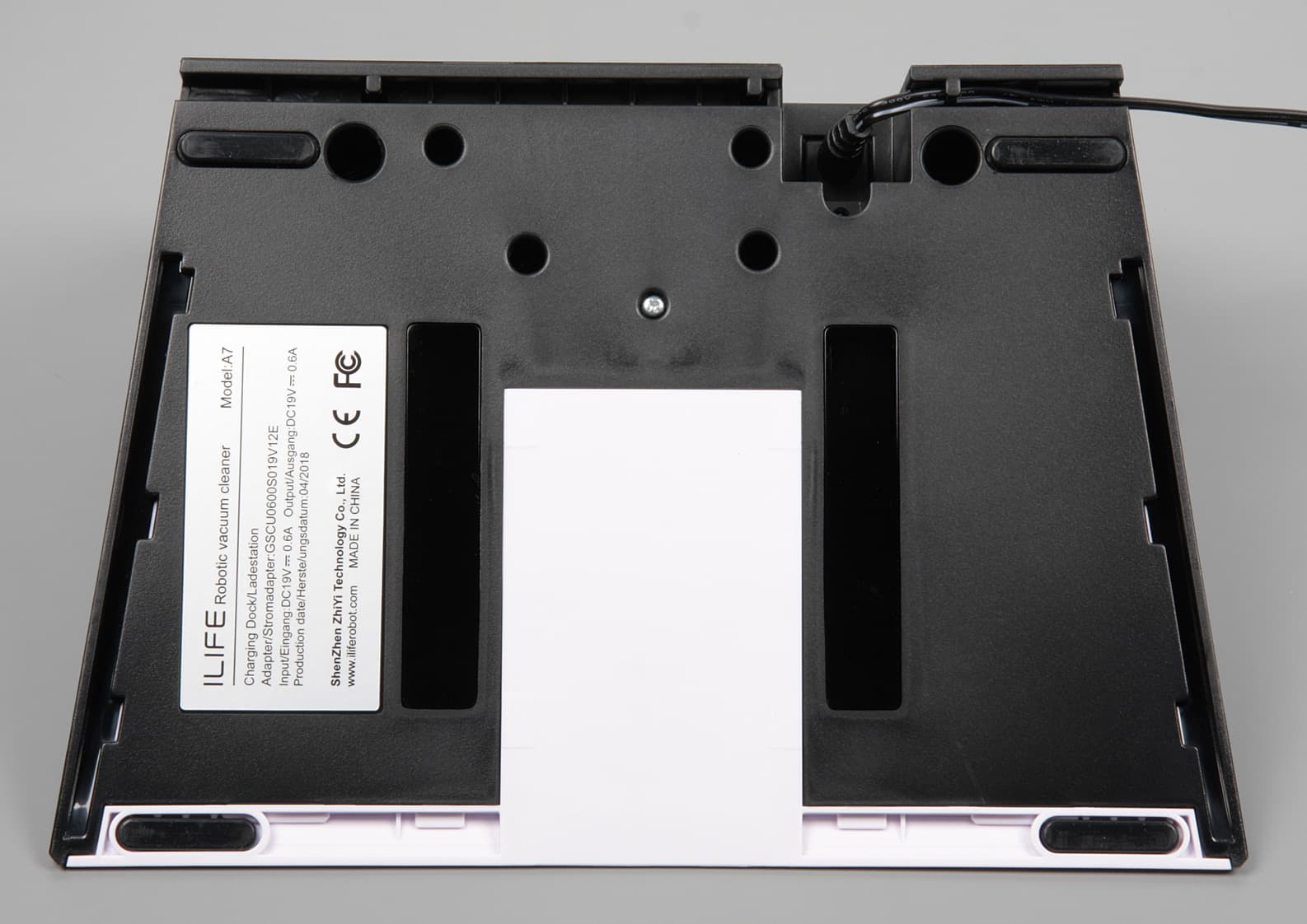 Питается база от внешнего адаптера питания, который также можно использовать для зарядки робота, минуя базу, если по какой-то причине она недоступна. Кабель можно уложить в каналы на днище базы и вывести на правую или на левую сторону. Длина кабеля от адаптера равна 1,5 м.