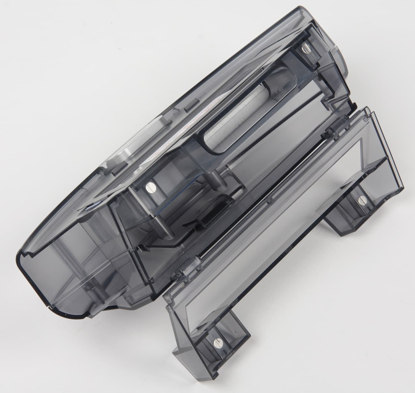 Корпус пылесборника выполнен из слегка тонированного полупрозрачного пластика, но особой пользы это не приносит, так как взглянуть на него можно только или перевернув пылесос днищем вверх или вынув пылесборник. Передняя часть пылесборника откидывается на большой угол, что позволяет без труда вытряхнуть скопившийся мусор. Однако отсек для мусора относительно узкий и его будет неудобно чистить с помощью обычного пылесоса с щелевой насадкой, также передняя перегородка на откидывающейся части невысокая, поэтому мусор легко просыпается из закрытого пылесборника. Именно высота этой перегородки ограничивает полезную емкость пылесборника по отношению к тяжелому мусору.