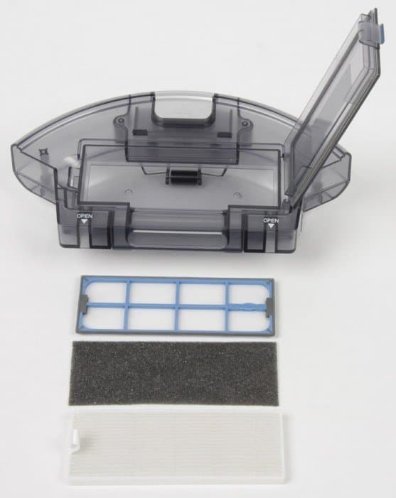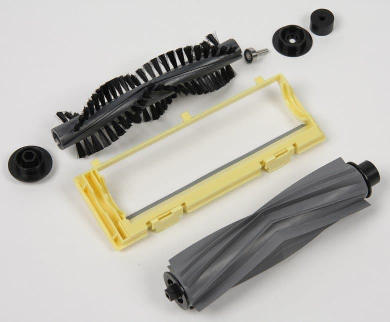 Запасные части и расходные материалы в комплекте поставки представлены сменным складчатым фильтром последней ступени, валиком-скребком (щетка с ворсом установлена), двумя запасными резиновыми скребками и набором (правая и левая) боковых щеток. Есть и комбинированная щетка-гребенка, которую можно использовать для чистки пылесборника, самого робота и основной щетки в частности.
