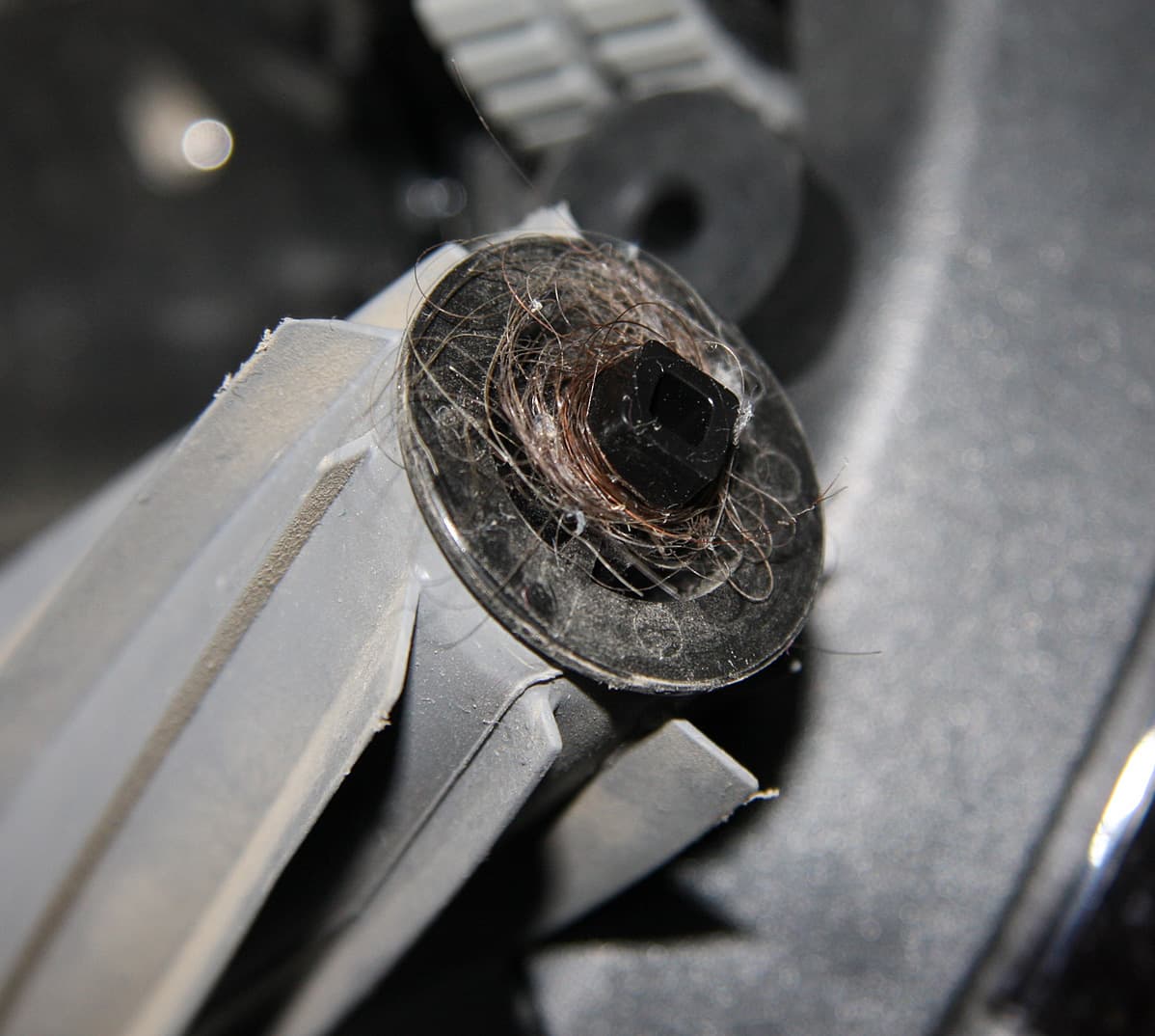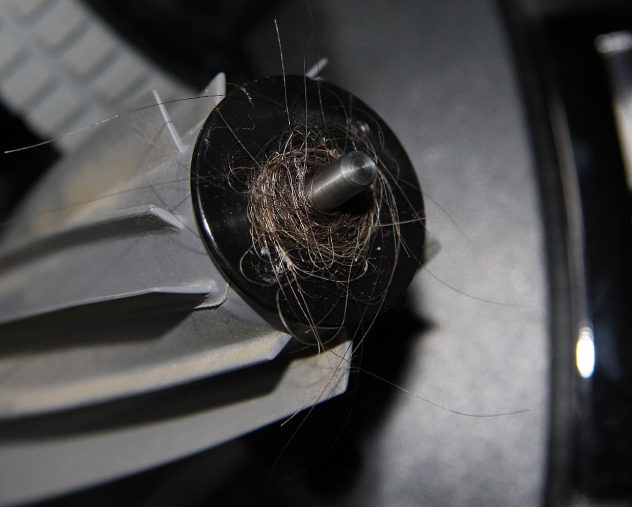 Вал основной щетки гладкий, относительно большого диаметра и с продольными канавками — это облегчает освобождение вала просто пальцами без помощи инструментов от ниток, волос и прочего намотавшегося. Щетина на этой щетке имеет среднюю жесткость, а ее пучки идут волнами, что уменьшает звук от вращения щетки в контакте с полом. Торцы оси щетки заглушены бобышками из черного пластика. Из центра одной выходит стальная ось, которая, вращается в шариковом подшипнике, запрессованном в торец оси щетки. На эту ось надевается бобышка из резины, которая по замыслу разработчиков должна снижать шум и вибрации.