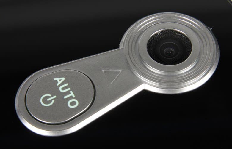 В зависимости от текущего состояния этот индикатор светится или мигает зеленым, оранжевым или красным. Яркость индикатора невысокая, в освещенном помещении из-за отблесков на серебристой поверхности кнопки сложно рассмотреть, что именно показывает индикатор. Дополнительно о своем состоянии робот информирует с помощью коротких и не очень громких звуковых сигналов и плохоразборчивых сообщений на английском языке. Отключить звуковое оповещение нельзя. Перед кнопкой есть глазок направленной вверх камеры, прикрытый защитным минеральным стеклом.