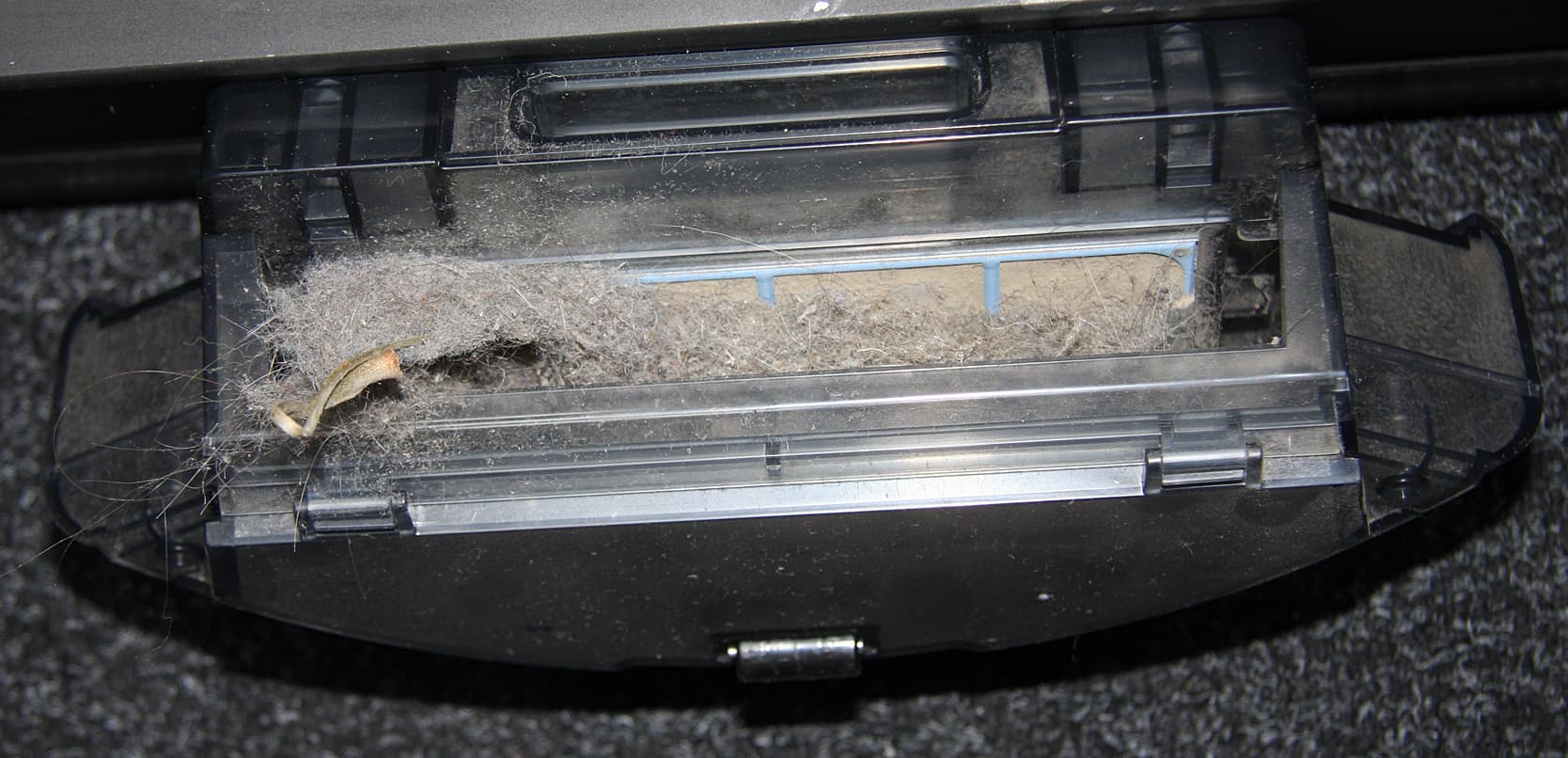 Пылесборник переполнился так, что мусор из него начал вываливаться обратно.