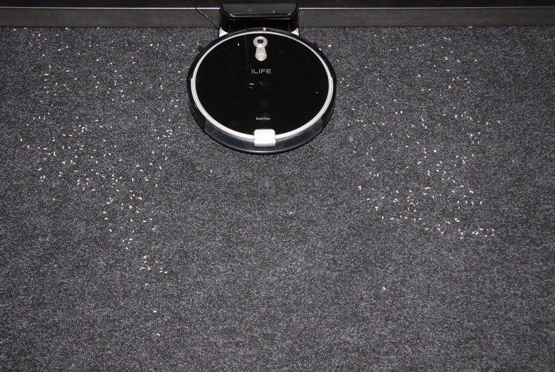 Робот убирает быстро, но качество не самое высокое, мало того, что за один проход много риса остается на полу, так еще и не везде робот проезжает при первом запуске. Вот результат после первого цикла уборки: