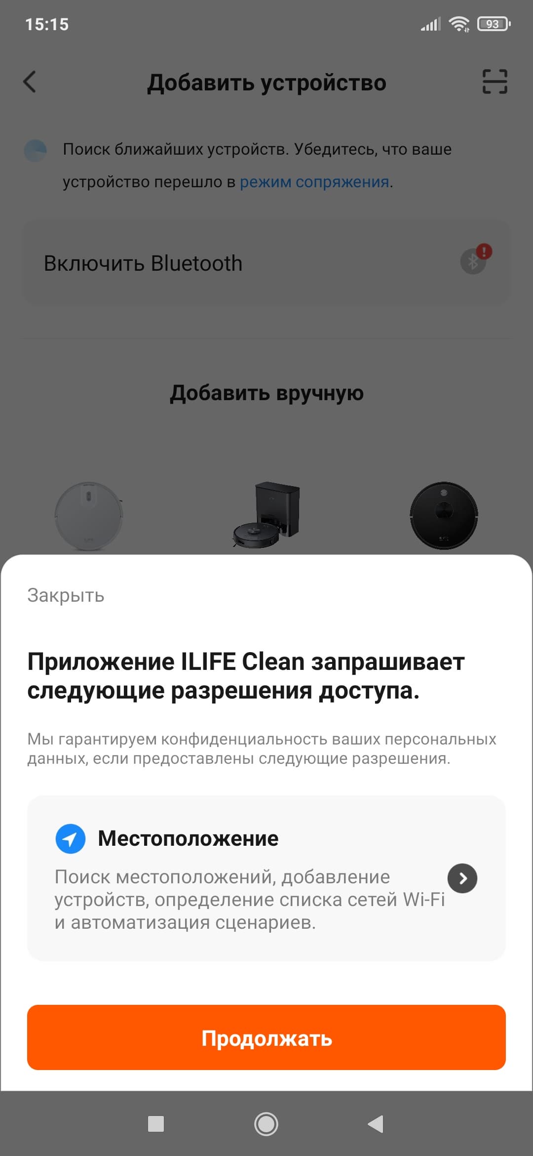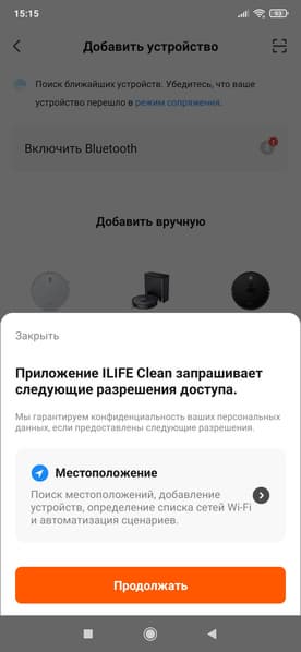 Для начала подключения пылесоса следует предоставить разрешение на определение местоположения и включить Bluetooth. Затем — воспользоваться кнопкой «Добавить устройство». Пылесос может быть обнаружен автоматически (если его перевести в режим сопряжения), а можно просто выбрать его из списка представленных моделей. Благо их тут не много, и искать нужный индекс не придется.