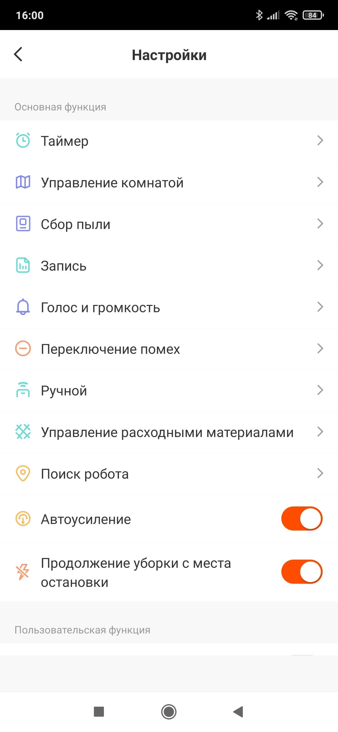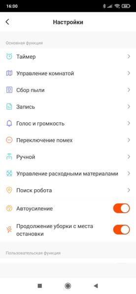 Раздел «Поиск робота» заставляет заблудившееся в квартире устройство «подать голос». Пункты «Всасывание» и «Объем воды» позволяют настроить нужную мощность сухой и влажной уборки — доступны четыре уровня интенсивности.