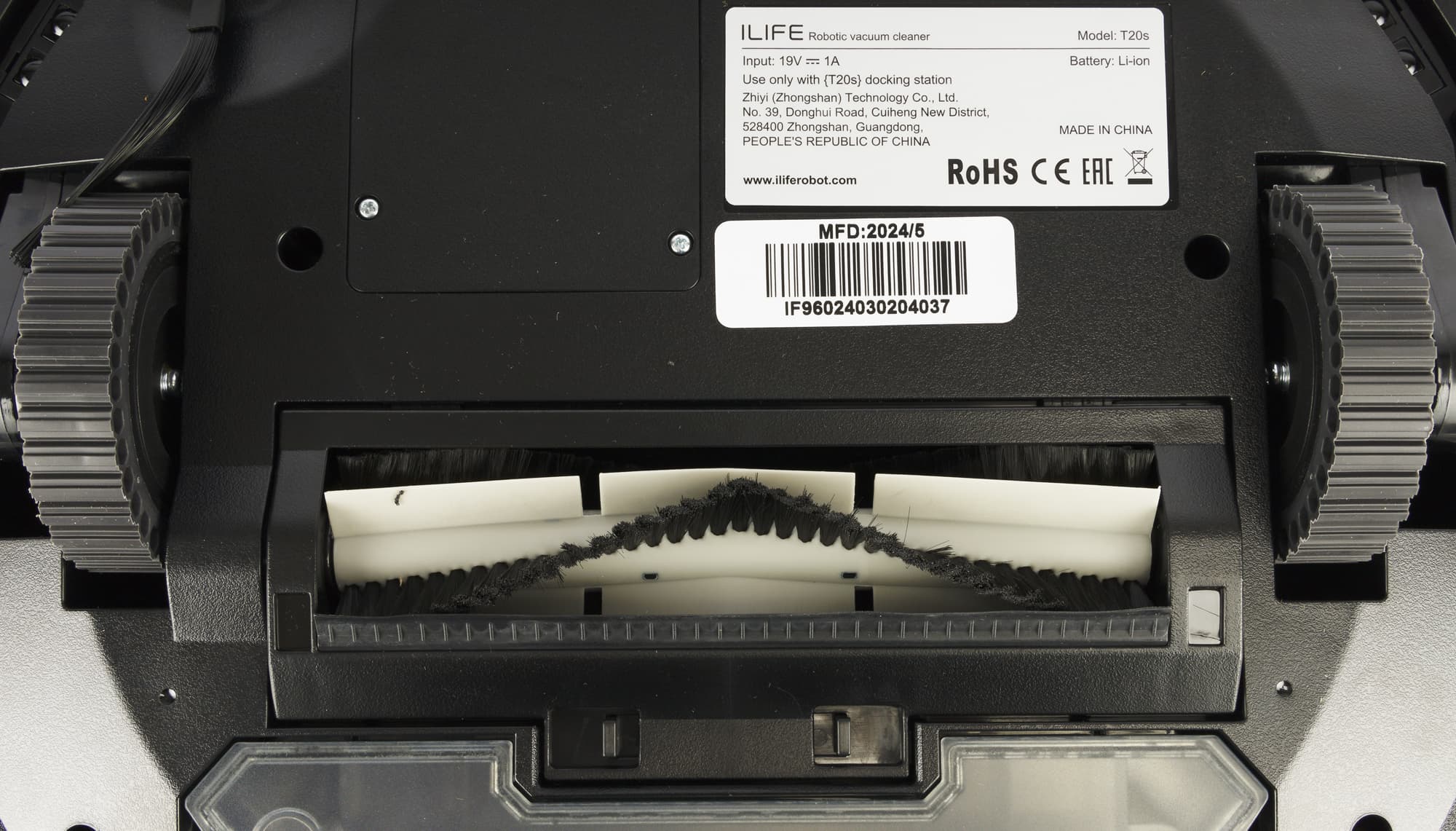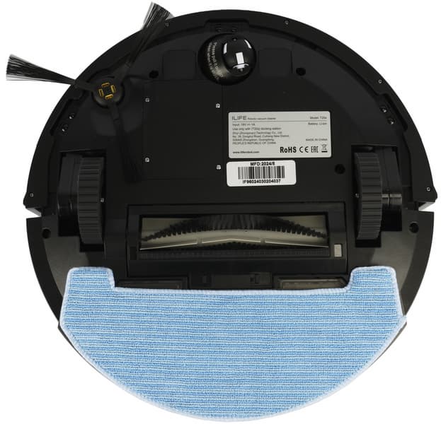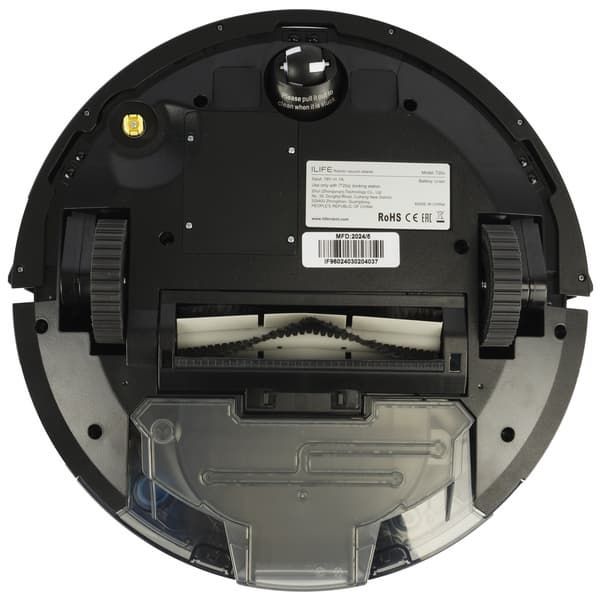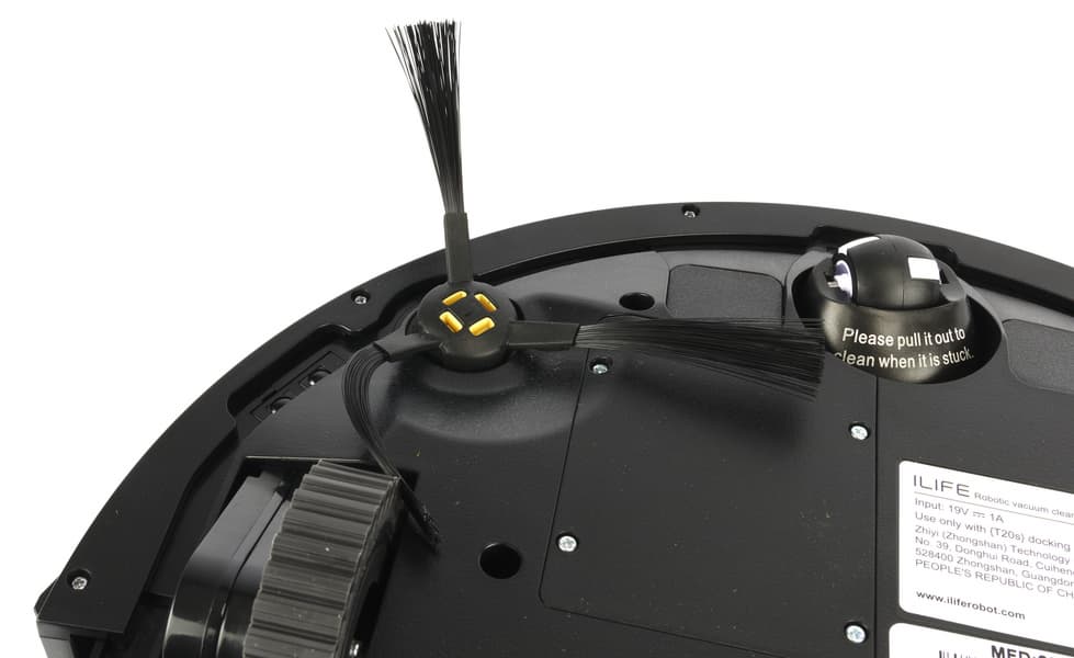 Конструкция у пылесоса традиционная, проверенная временем, и в то же время — современная: круглый корпус, одна боковая щетка и три колеса — два ведущих и опорное. Ход подвески составляет от 10 до 29 мм, что, согласно данным от производителя, позволяет роботу преодолевать препятствия высотой до 19 мм.