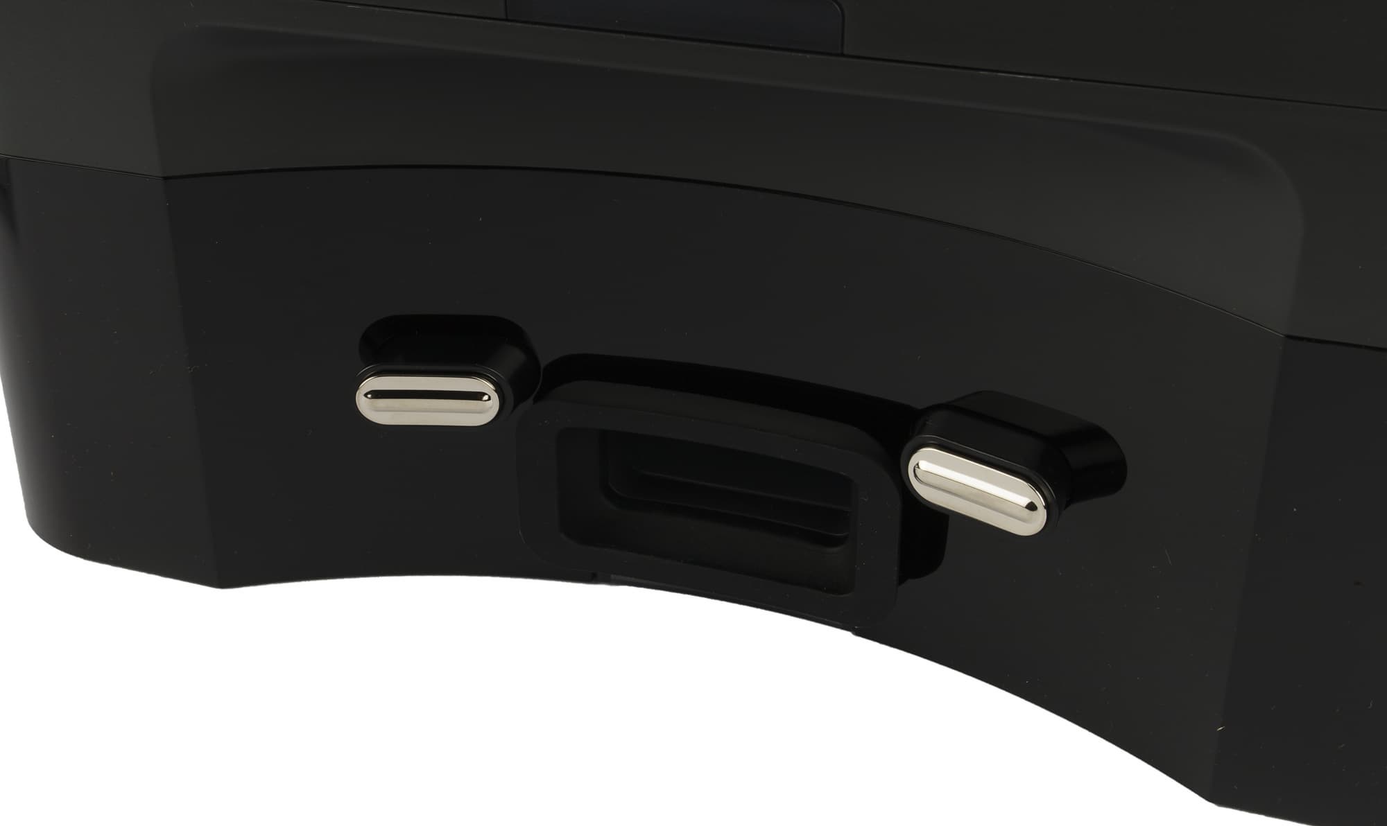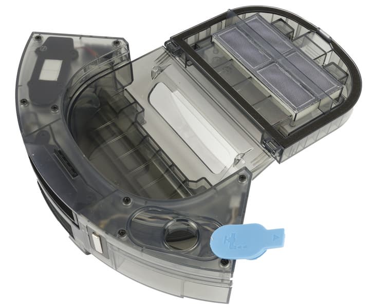 Отсек для модуля комбинированной (сухой и влажной) уборки расположен в задней части корпуса. Мусоросборник удерживается в нем удобной и надежной защелкой. В отличие от более простых роботов-пылесосов, у этой модели в контейнере есть отверстие, через которое базовая станция удаляет из контейнера мусор. Закрывается отверстие на подпружиненную шторку. Также на контейнере мы видим два контакта для зарядки.