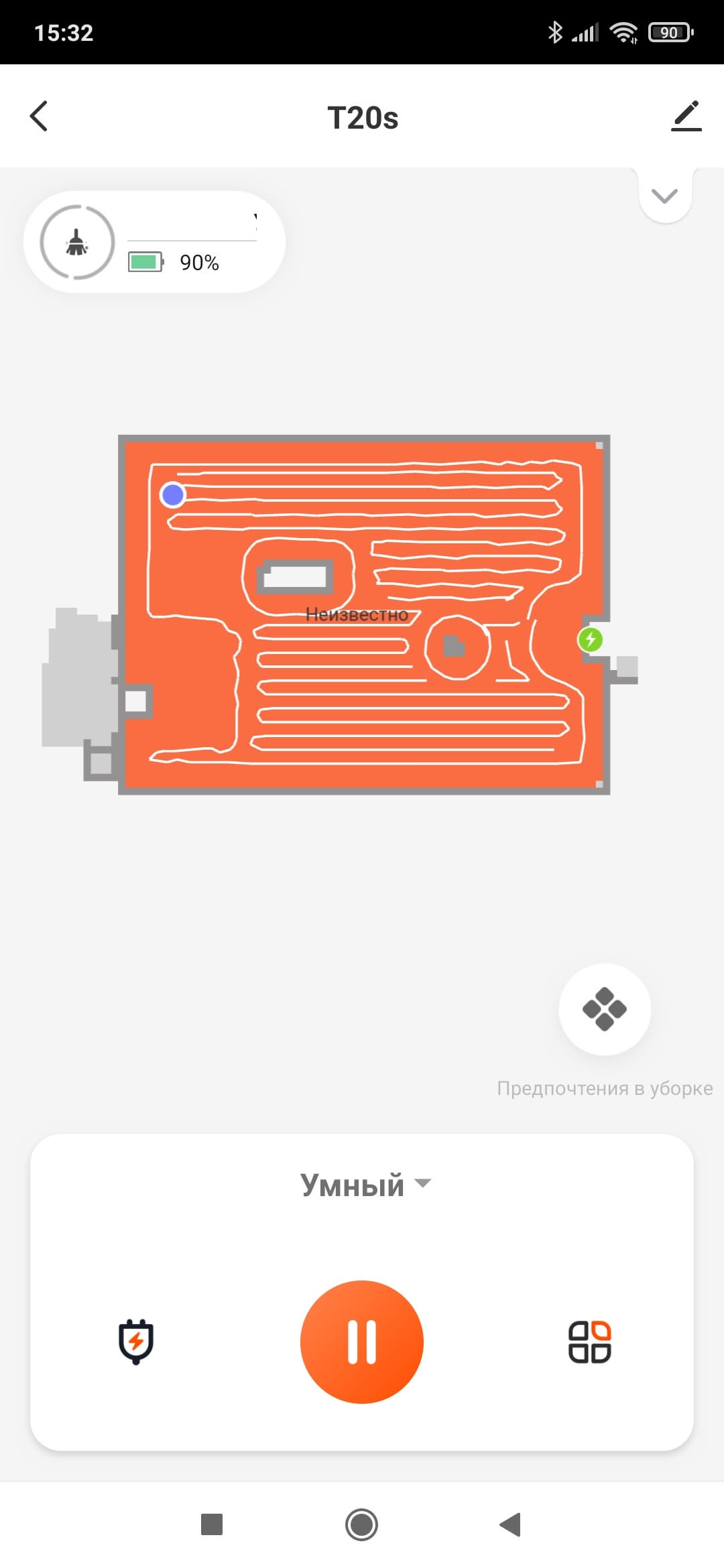 В верхней части окна отображается уровень заряда аккумулятора (в процентах). Кнопки, расположенные в нижней части, позволяют отправить пылесос на базу, начать или приостановить уборку, а также выбрать один из доступных режимов.