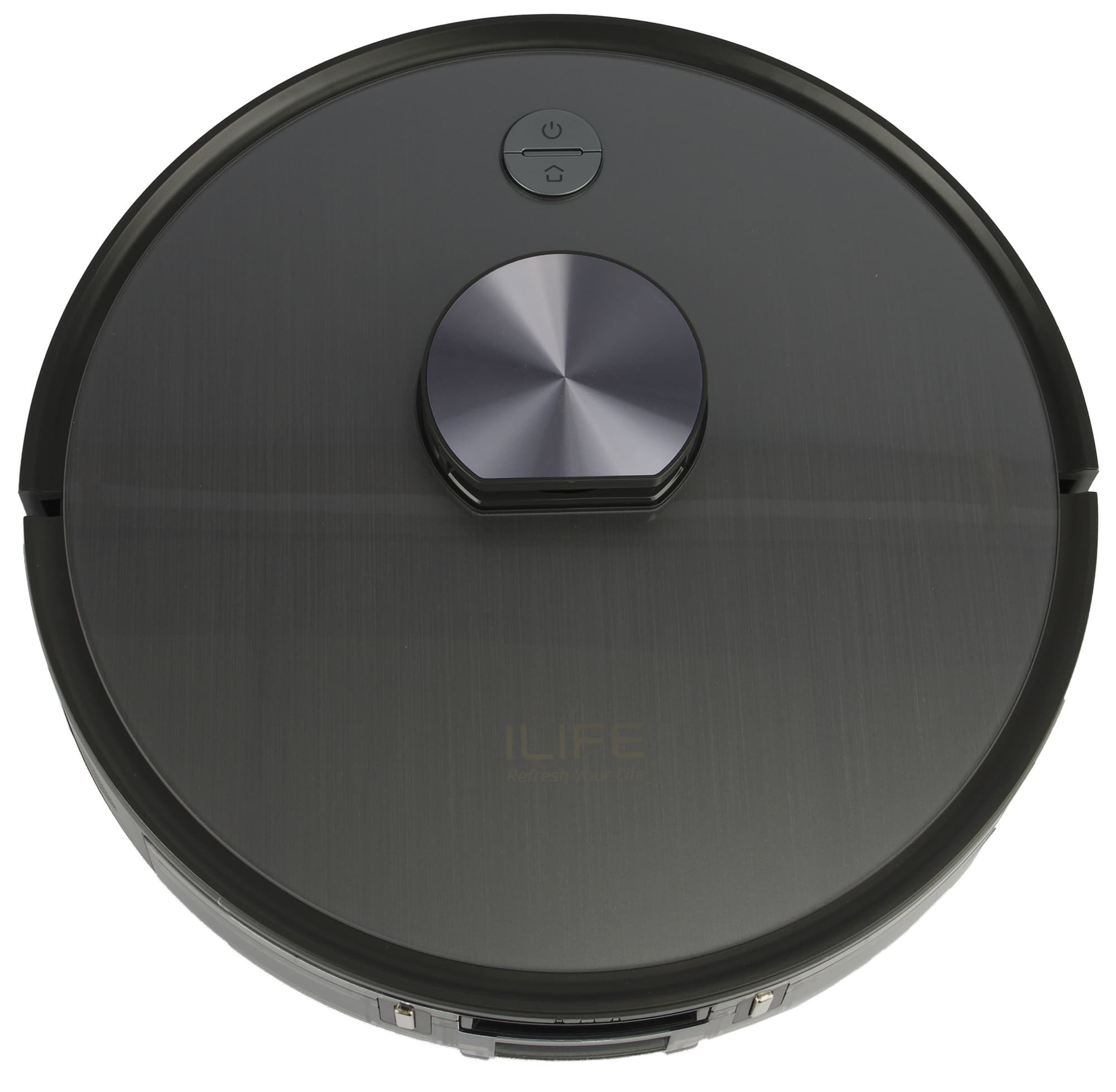 Глянцевая верхняя панель серого цвета оформлена под металл и украшена логотипом производителя. На ней выделяются башенка лазерного радара и двухкнопочная панель управления со светодиодной подсветкой.