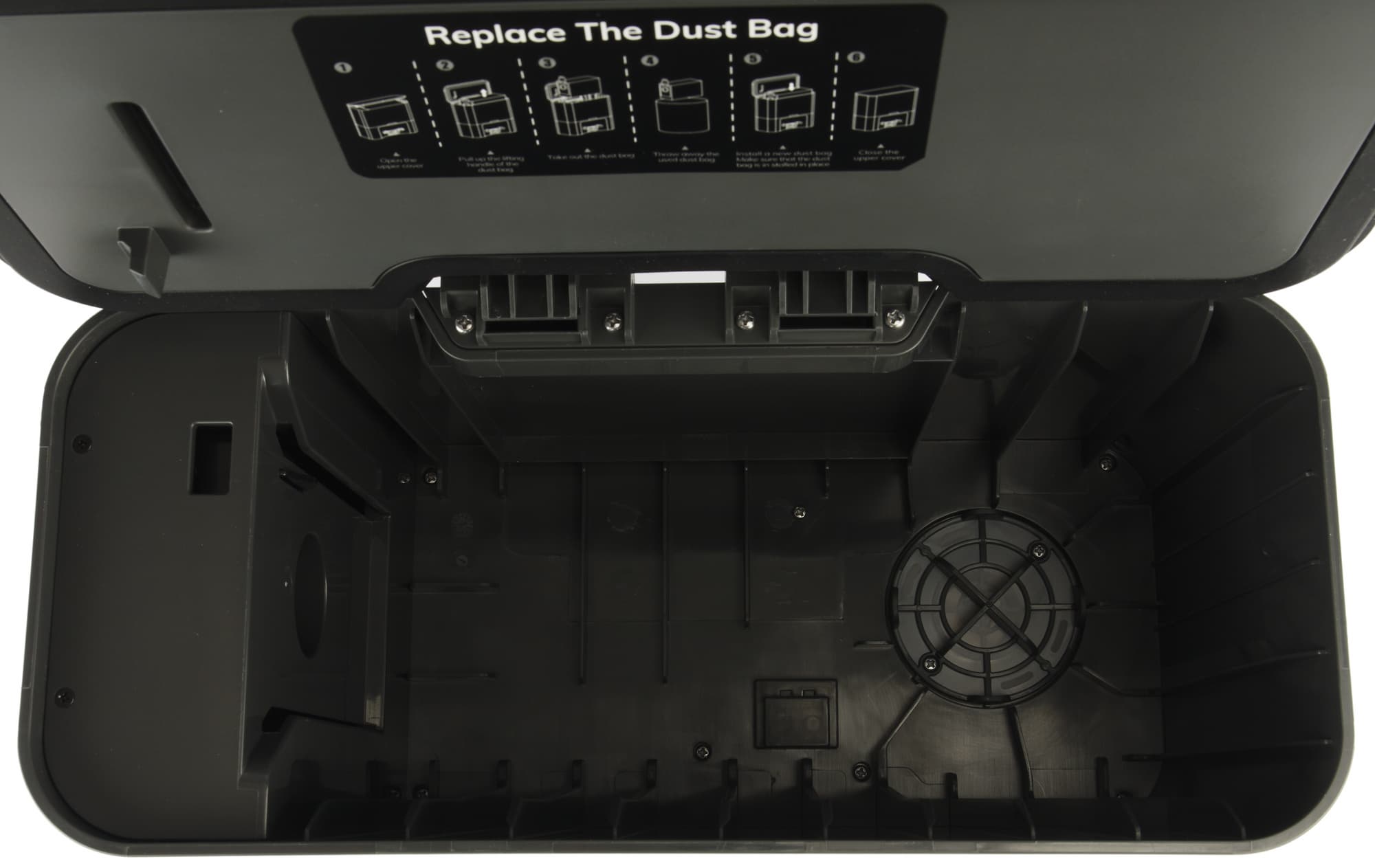 На внутреннюю сторону крышки нанесена краткая инструкция, иллюстрирующая установку мешка для мусора. Посадочное место оборудовано датчиком, который контролирует наличие контейнера: без него функция самоочистки не включится.