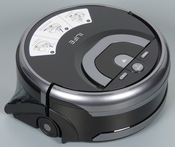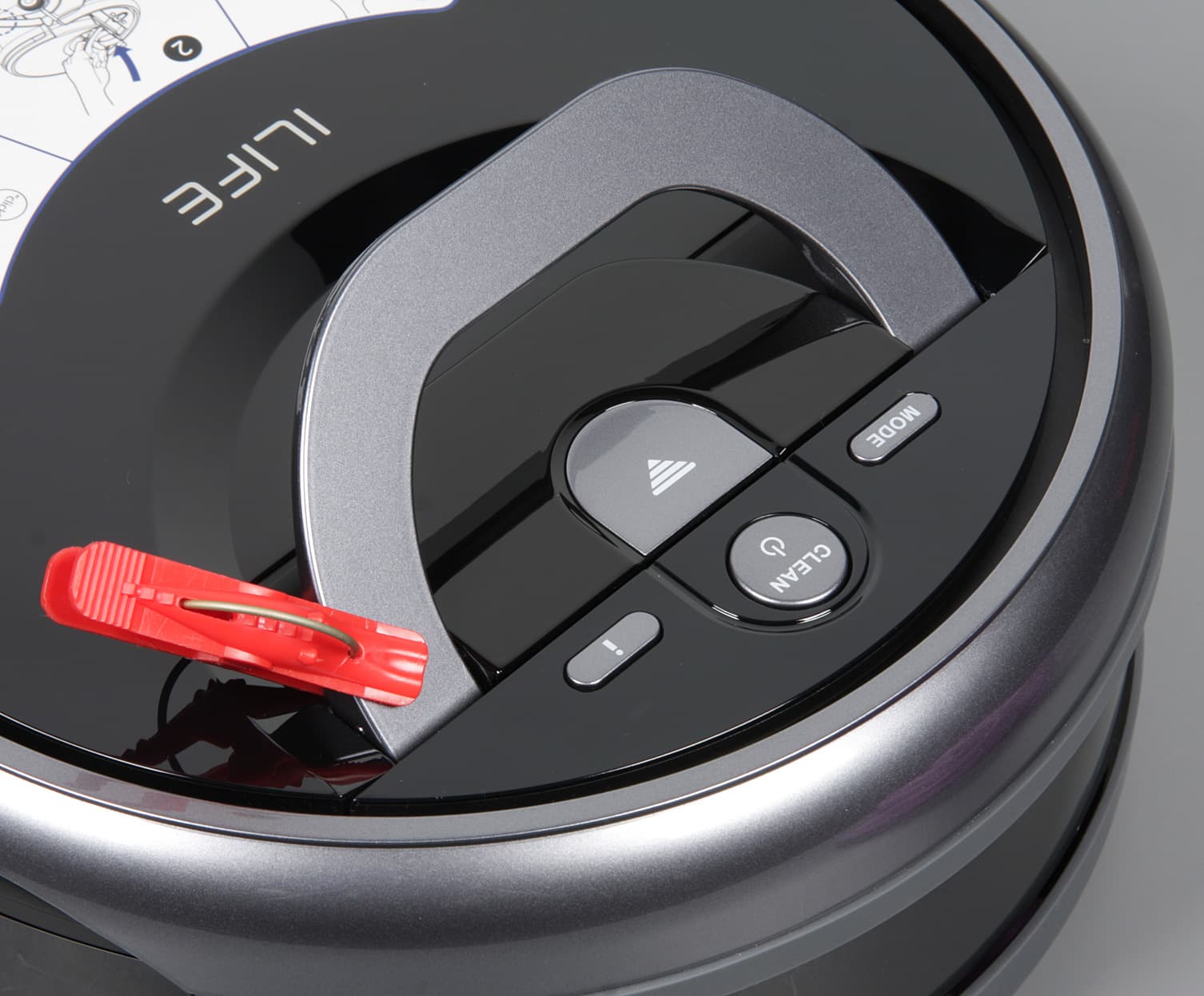 Робот состоит из двух больших частей — из платформы с приводами и бака с емкостями. Бак отделяется от платформы, если нажать на фиксатор и потянуть бак вверх за ручку. Как правильно установить бак обратно, поясняет инструкция в картинках на наклейке на верхней панели.