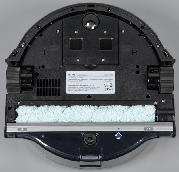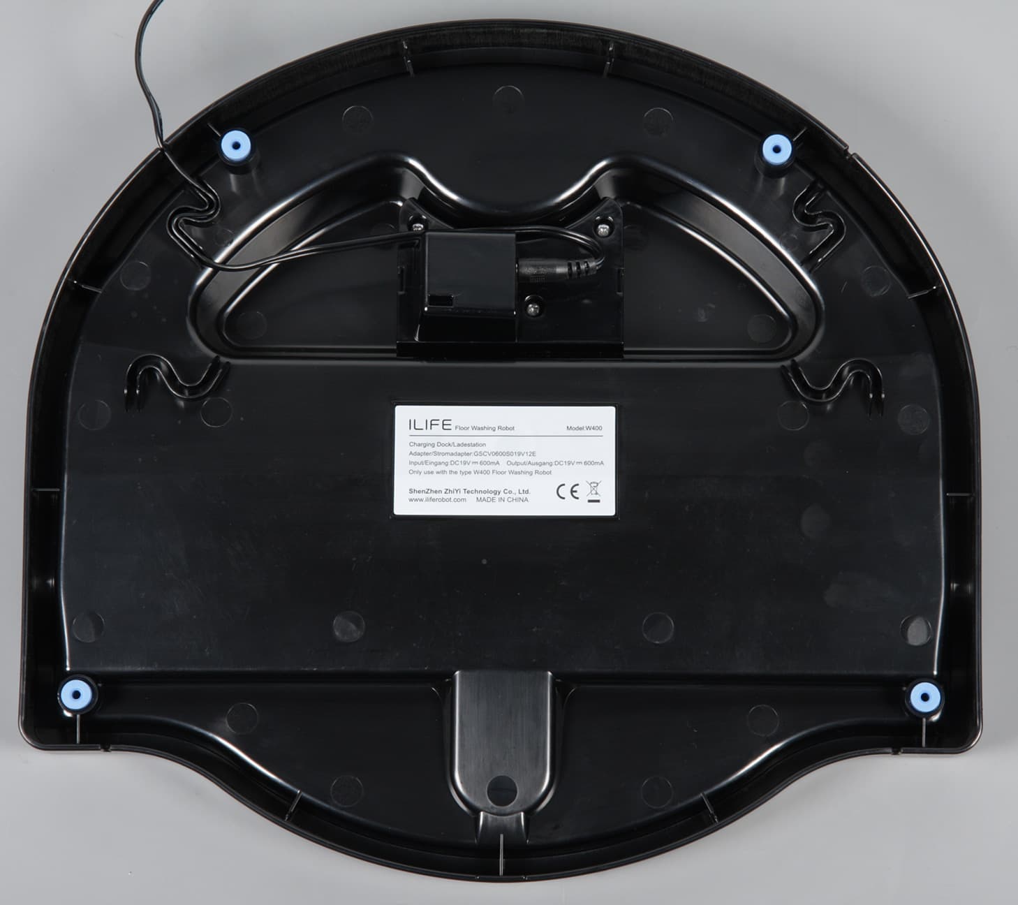 На днище расположены передний опорный поворотный ролик, две контактные площадки, крышка батарейного отсека, два ведущих колеса, выпускная решетка, отверстия для разбрызгивания воды, валик, скребок и задний опорный ролик. Снизу на бампере находятся три ИК-датчика перепада высоты, благодаря которым робот может избежать падения со ступенек.