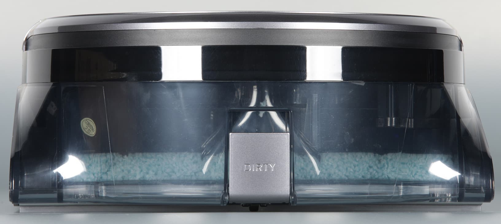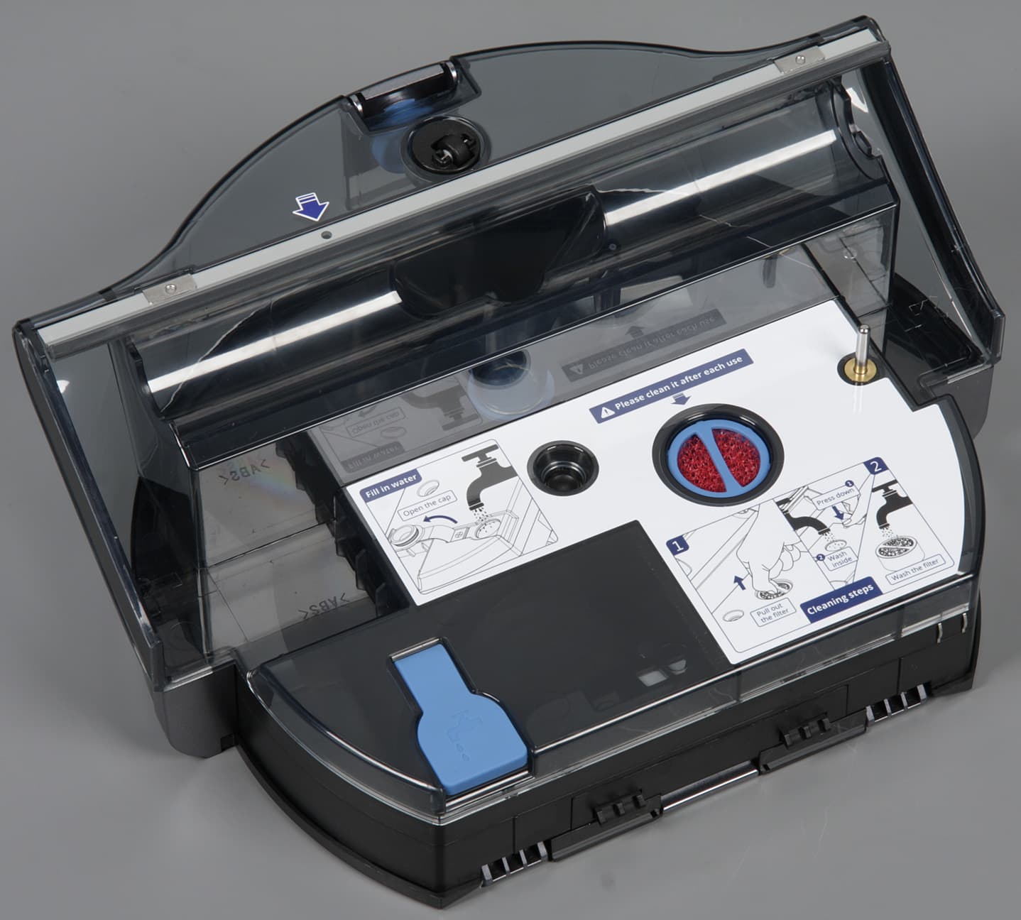 В баке две емкости — для чистой воды и для грязной. Заливное отверстие в первой и сливное во второй закрывают заглушки из упругого пластика. Часть корпуса бака изготовлена из прозрачного слегка тонированного пластика, но когда бак установлен на платформу робота, определить можно только уровень грязной воды.