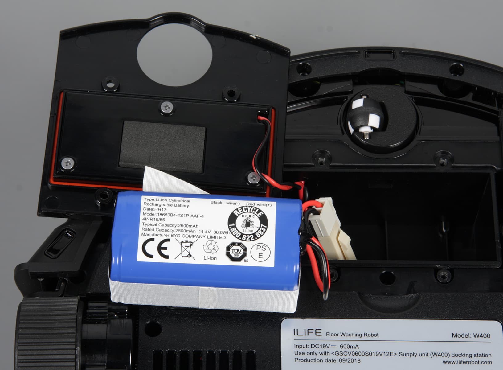 В данном роботе установлена литий-ионная аккумуляторная батарея. Батарейный блок составлен из четырех цилиндрических элементов популярного типоразмера 18650. Крышка батарейного отсека имеет прокладку по периметру, обеспечивающую защиту от влаги.