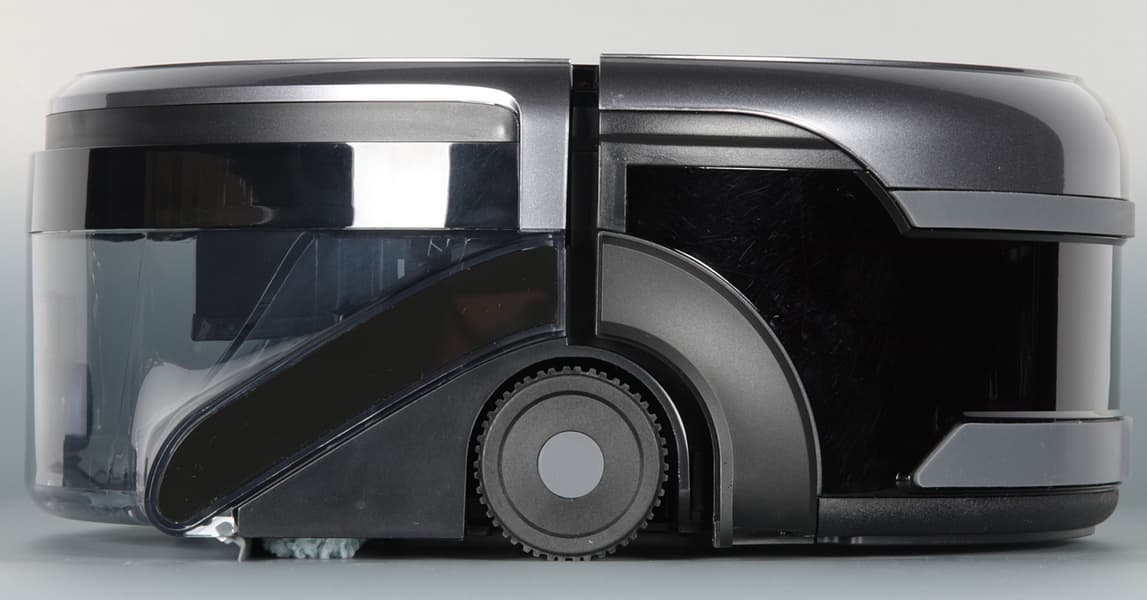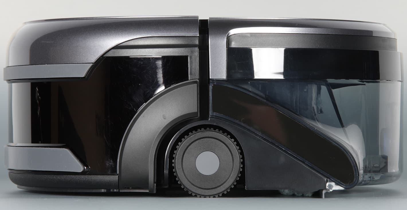 Небольшие ведущие колеса, малый дорожный просвет и отсутствие скосов на днище свидетельствуют, что робот предназначен для мытья ровных полов. Всю переднюю половину корпуса огибает подпружиненный бампер с небольшим ходом.