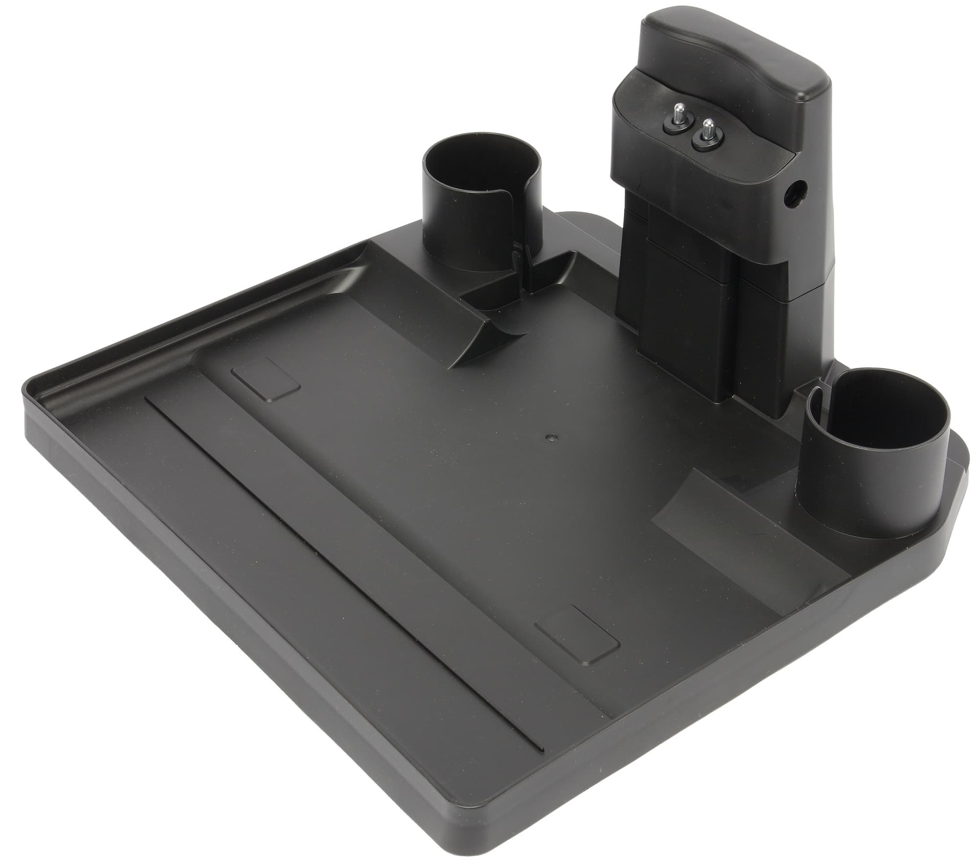 Базовая станция обеспечивает зарядку и самоочистку пылесоса. В ее плоской части есть небольшое углубление для сбора грязной воды при промывке ротора, а на вертикальном основании — два электрических контакта, обеспечивающие подключение пылесоса к источнику переменного тока. Цилиндрические углубления справа и слева от основания предназначены для хранения и сушки роторных щеток: их в комплекте нашего устройства две.